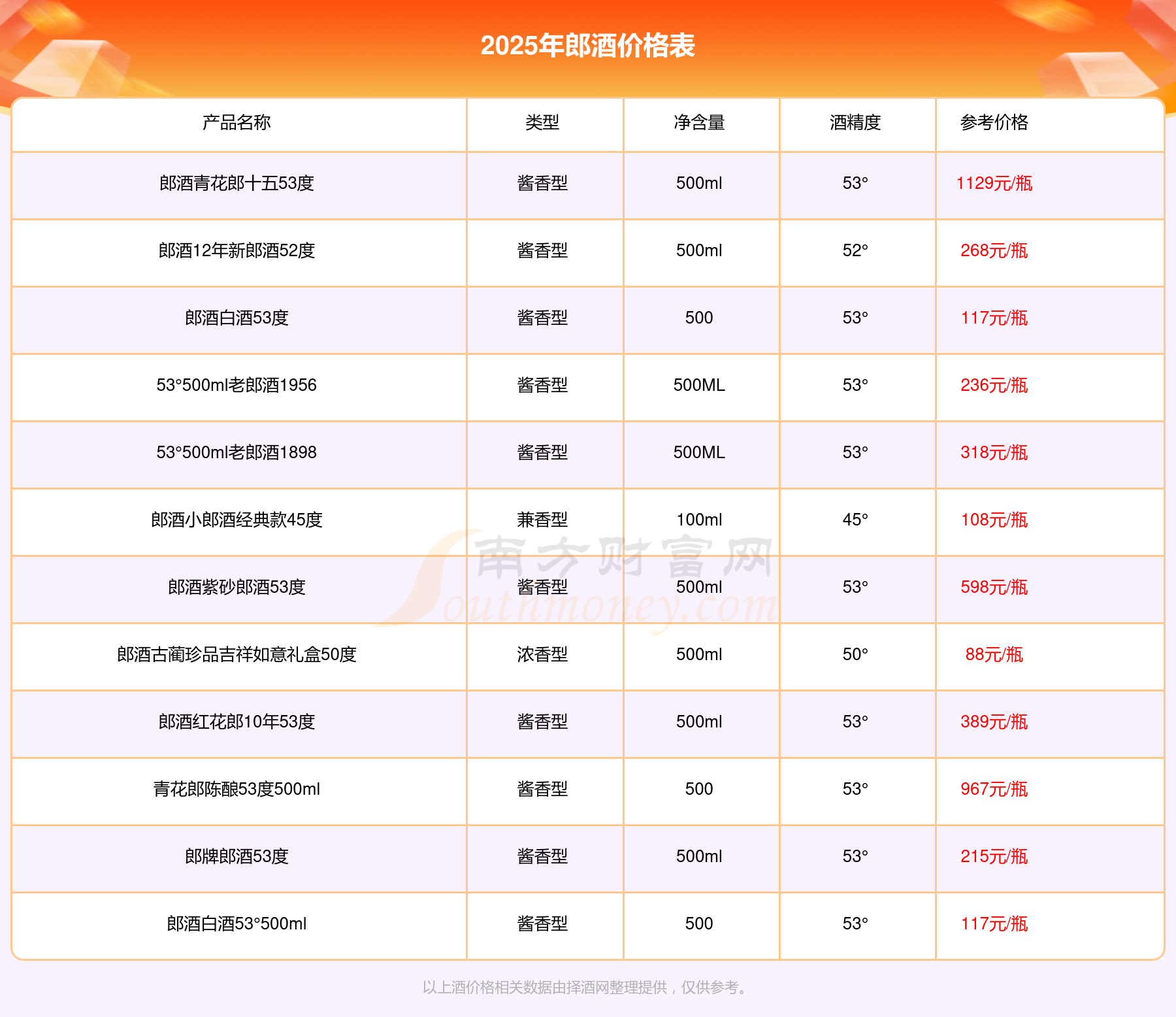 郎酒青花郎十五53度參考價(jià)1129元/瓶、青花郎陳釀53度500ml參考價(jià)967元/瓶、郎酒紫砂郎酒53度參考價(jià)598元/瓶、郎酒紅花郎10年53度參考價(jià)389元/瓶、53°500ml老郎酒1898參考價(jià)318元/瓶、郎酒12年新郎酒52度參考價(jià)268元/瓶。
