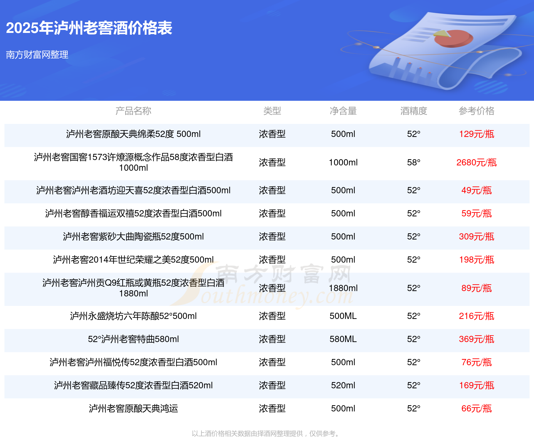 瀘州老窖國(guó)窖1573春釀鼠兆豐年E 55度參考價(jià)17999元/瓶、瀘州老窖國(guó)窖1573生命中的那壇酒55度014參考價(jià)9999元/瓶、瀘州老窖國(guó)窖1573春釀鼠兆豐年A 55度參考價(jià)5088元/瓶、瀘州老窖國(guó)窖1573生命中的那壇酒55度013濃香型白酒1000ml參考價(jià)4988元/瓶、瀘州老窖國(guó)窖1573生命中的那壇酒55度009 1000ml參考價(jià)4288元/瓶、瀘州老窖國(guó)窖1573中國(guó)品味52度濃香型白酒500ml參考價(jià)2888元/瓶、瀘州老窖國(guó)窖1573許燎源概念作品58度濃香型白酒1000ml參考價(jià)2680元/瓶。