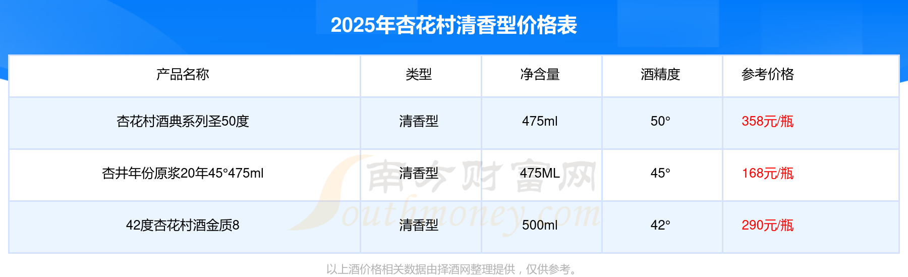 杏花村酒典系列圣50度參考價358元/瓶、42度杏花村酒金質(zhì)8參考價290元/瓶、杏井年份原漿20年45°475ml參考價168元/瓶。