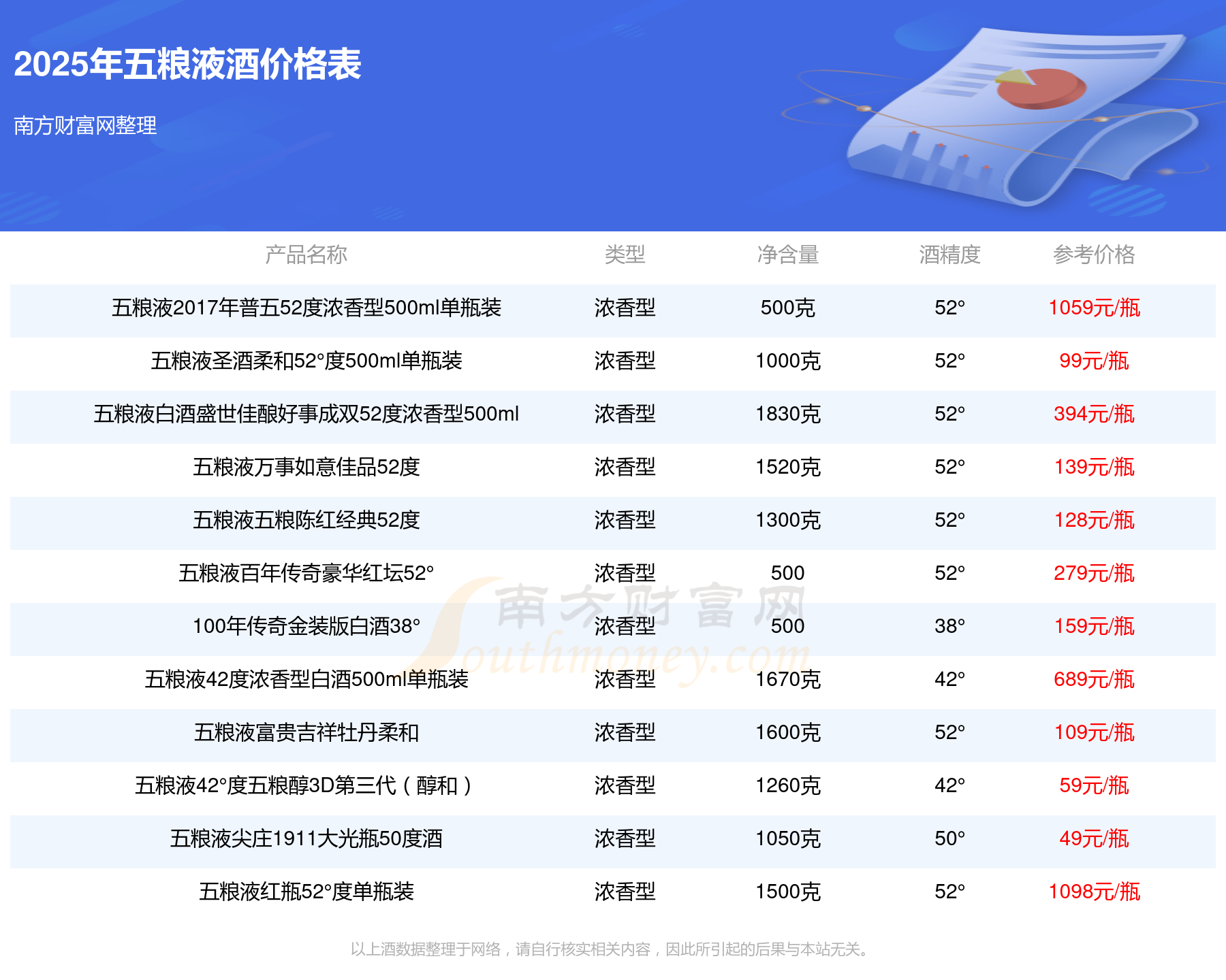 2025年,五糧液酒價格最高的是五糧液百年世博世紀(jì)榮耀紀(jì)念酒60°999ml,參考價26980元,最低的是五糧液干一杯小瓶46度,參考價16元,價格高低差為26964元。