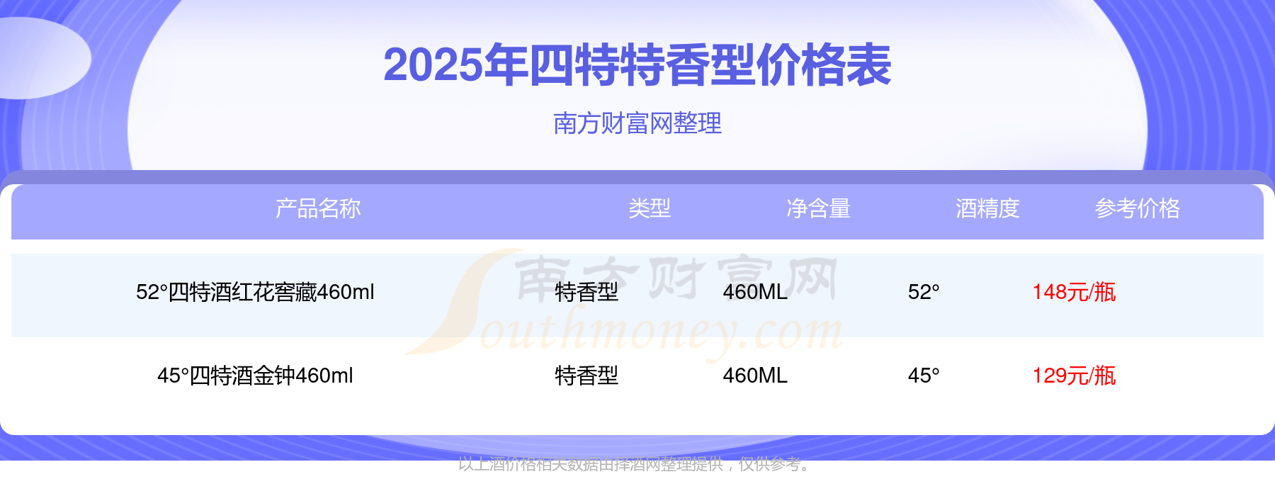 2025年,52°四特酒紅花窖藏460ml、45°四特酒金鐘460ml等四特特香型酒價(jià)格如下:52°四特酒紅花窖藏460ml參考價(jià)148元/瓶、45°四特酒金鐘460ml參考價(jià)129元/瓶。