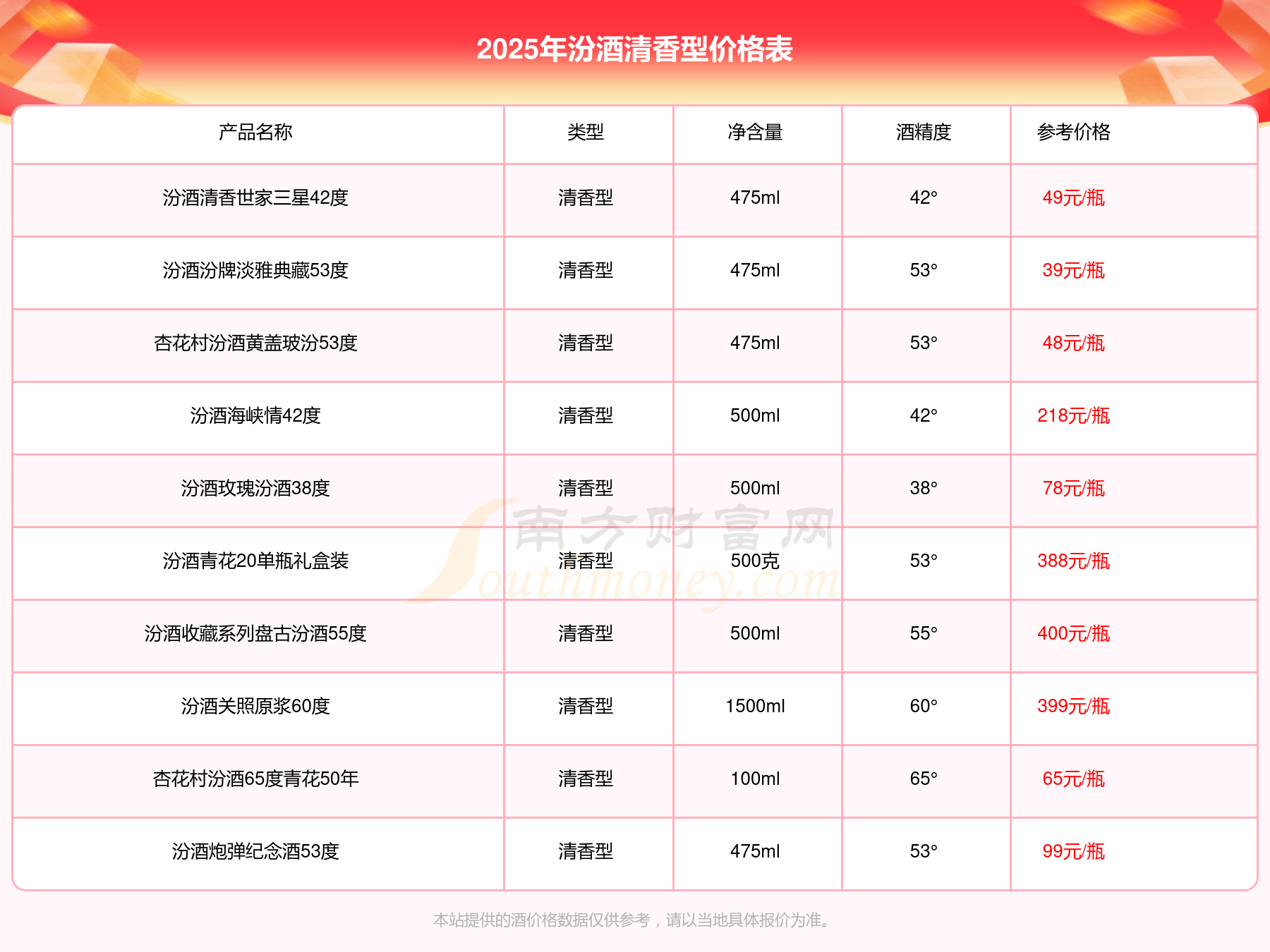 汾酒清香型酒最新價格2025:汾酒原漿一壇香60°3000ml參考價2180元/瓶、汾酒原漿一壇香60°1500ml參考價1536元/瓶、42度汾酒青花25參考價598元/瓶、汾酒收藏系列盤古汾酒55度參考價400元/瓶、汾酒關照原漿60度參考價399元/瓶、汾酒青花20單瓶禮盒裝參考價388元/瓶、汾酒海峽情42度參考價218元/瓶、汾酒窖藏一壇香52度參考價198元/瓶。