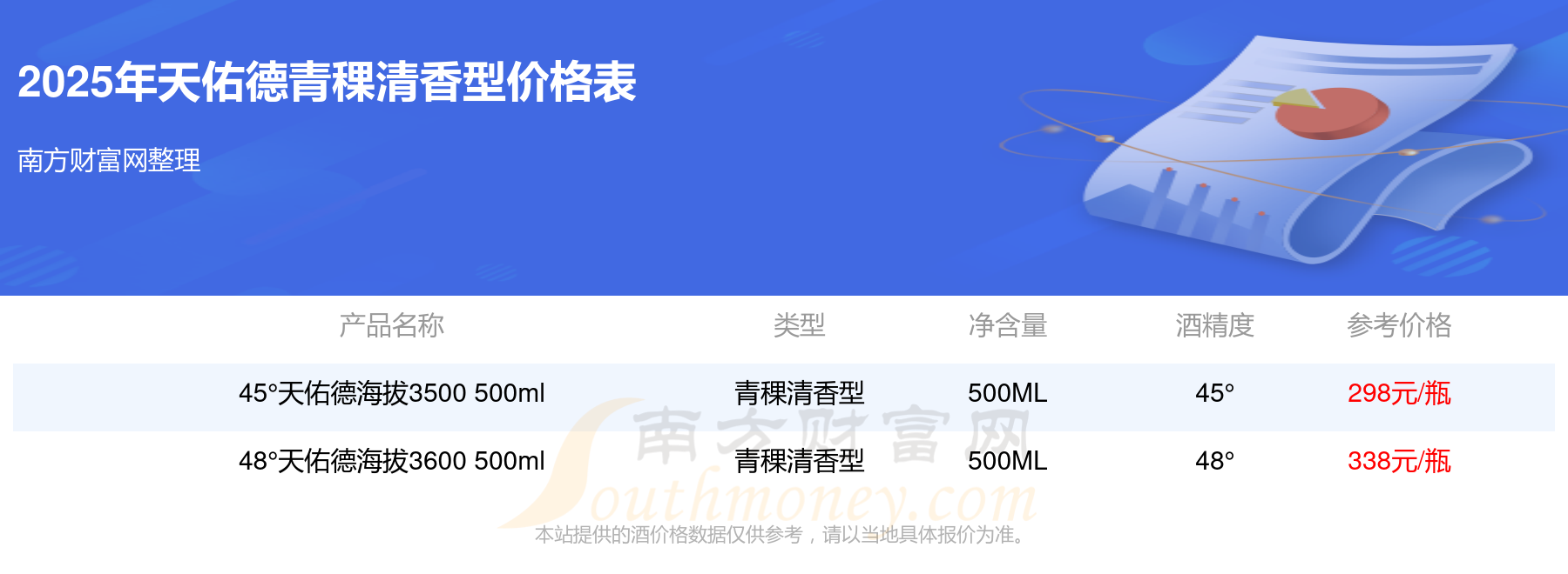 2025年,天佑德青稞清香型酒價格最高的是48°天佑德海拔3600 500ml,參考價338元,最低的是45°天佑德海拔3500 500ml,參考價298元,價格高低差為40元。