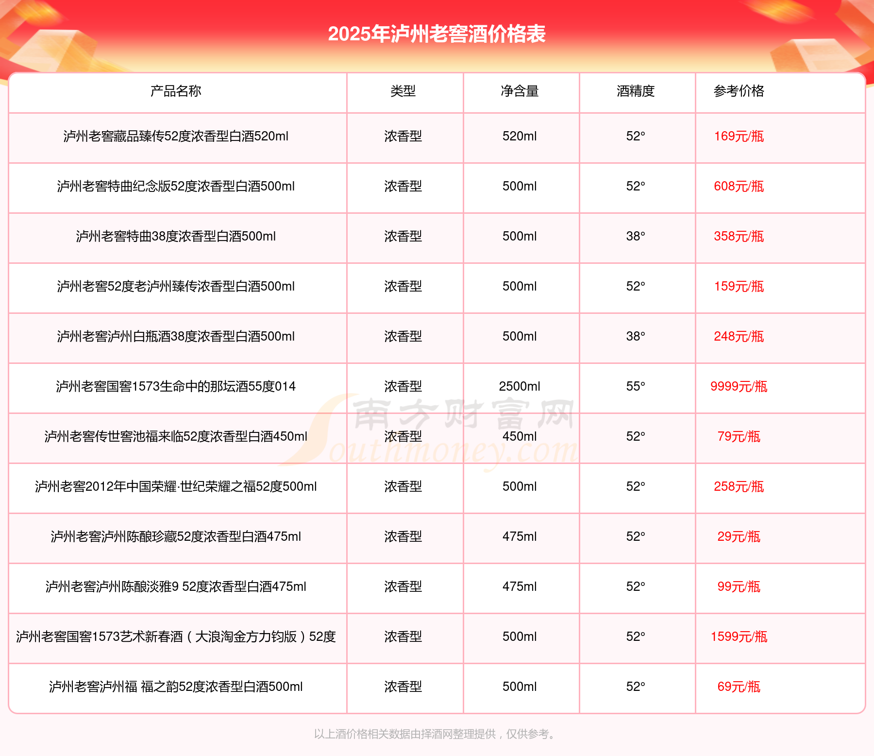 2025年,瀘州老窖國窖1573春釀鼠兆豐年E 55度、瀘州老窖國窖1573生命中的那壇酒55度014、瀘州老窖國窖1573春釀鼠兆豐年A 55度、瀘州老窖國窖1573生命中的那壇酒55度013濃香型白酒1000ml、瀘州老窖國窖1573生命中的那壇酒55度009 1000ml、瀘州老窖國窖1573中國品味52度濃香型白酒500ml、瀘州老窖國窖1573許燎源概念作品58度濃香型白酒1000ml等瀘州老窖酒價格如下:瀘州老窖國窖1573春釀鼠兆豐年E 55度參考價17999元/瓶、瀘州老窖國窖1573生命中的那壇酒55度014參考價9999元/瓶、瀘州老窖國窖1573春釀鼠兆豐年A 55度參考價5088元/瓶、瀘州老窖國窖1573生命中的那壇酒55度013濃香型白酒1000ml參考價4988元/瓶、瀘州老窖國窖1573生命中的那壇酒55度009 1000ml參考價4288元/瓶、瀘州老窖國窖1573中國品味52度濃香型白酒500ml參考價2888元/瓶、瀘州老窖國窖1573許燎源概念作品58度濃香型白酒1000ml參考價2680元/瓶。