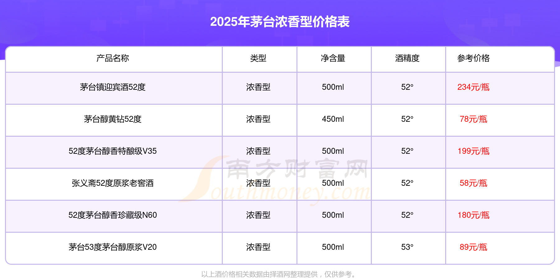 茅臺濃香型酒最新價格2025:茅臺鎮(zhèn)迎賓酒52度參考價234元/瓶、52度茅臺醇香特釀級V35參考價199元/瓶、52度茅臺醇香珍藏級N60參考價180元/瓶、茅臺53度茅臺醇原漿V20參考價89元/瓶。