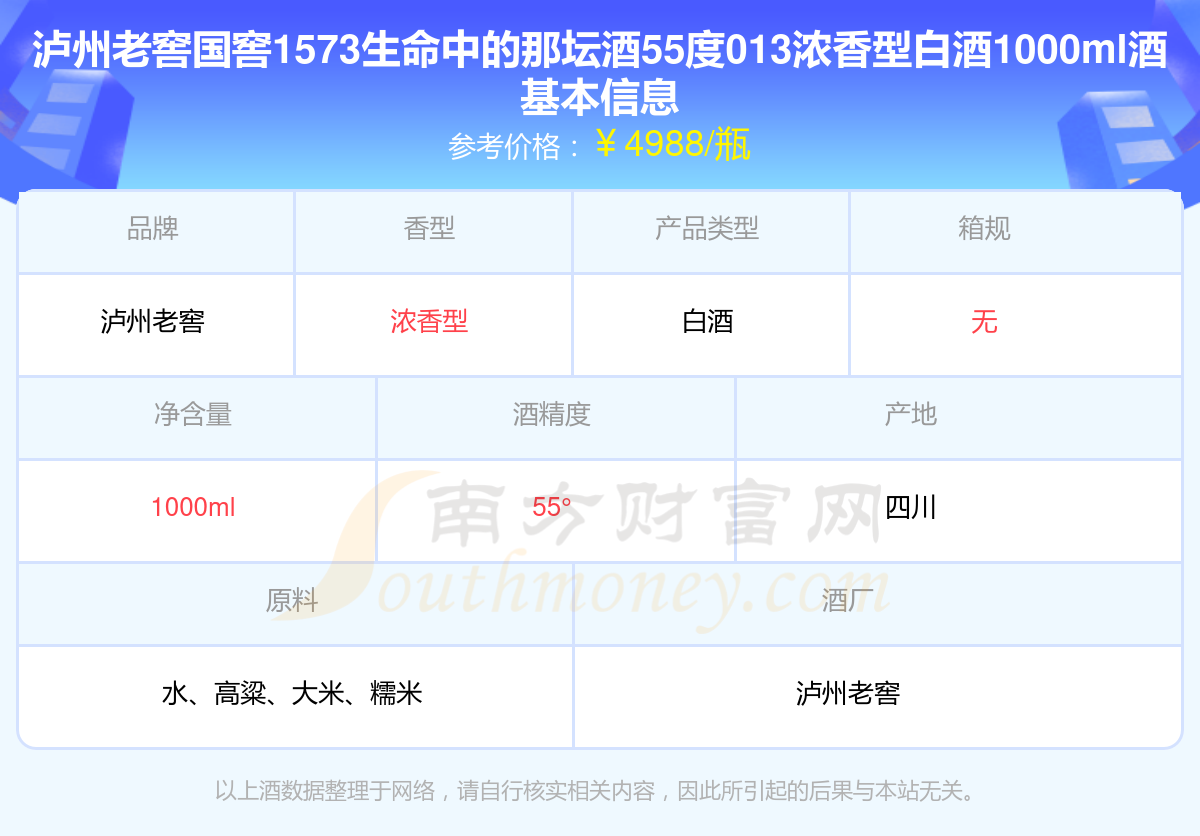 瀘州老窖國(guó)窖1573生命中的那壇酒55度013濃香型白酒1000ml基本信息