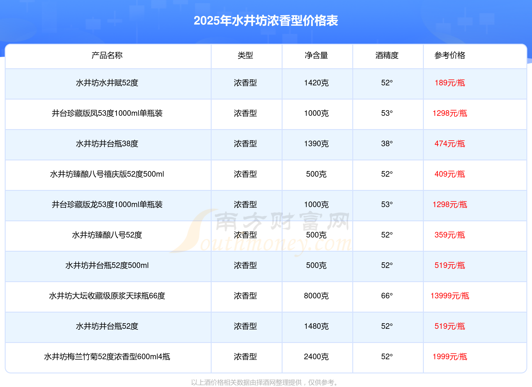 2025水井坊濃香型酒最新價格:水井坊大壇收藏級原漿天球瓶66度參考價13999元/瓶、水井坊博物館壹號53度雙瓶裝參考價10988元/瓶、53°水井坊公元十三600ml參考價2580元/瓶、水井坊梅蘭竹菊52度濃香型600ml4瓶參考價1999元/瓶、水井坊菁翠52度500ml參考價1650元/瓶、井臺珍藏版龍53度1000ml單瓶裝參考價1298元/瓶、井臺珍藏版鳳53度1000ml單瓶裝參考價1298元/瓶、53°水晶水井坊500ml參考價898元/瓶。
