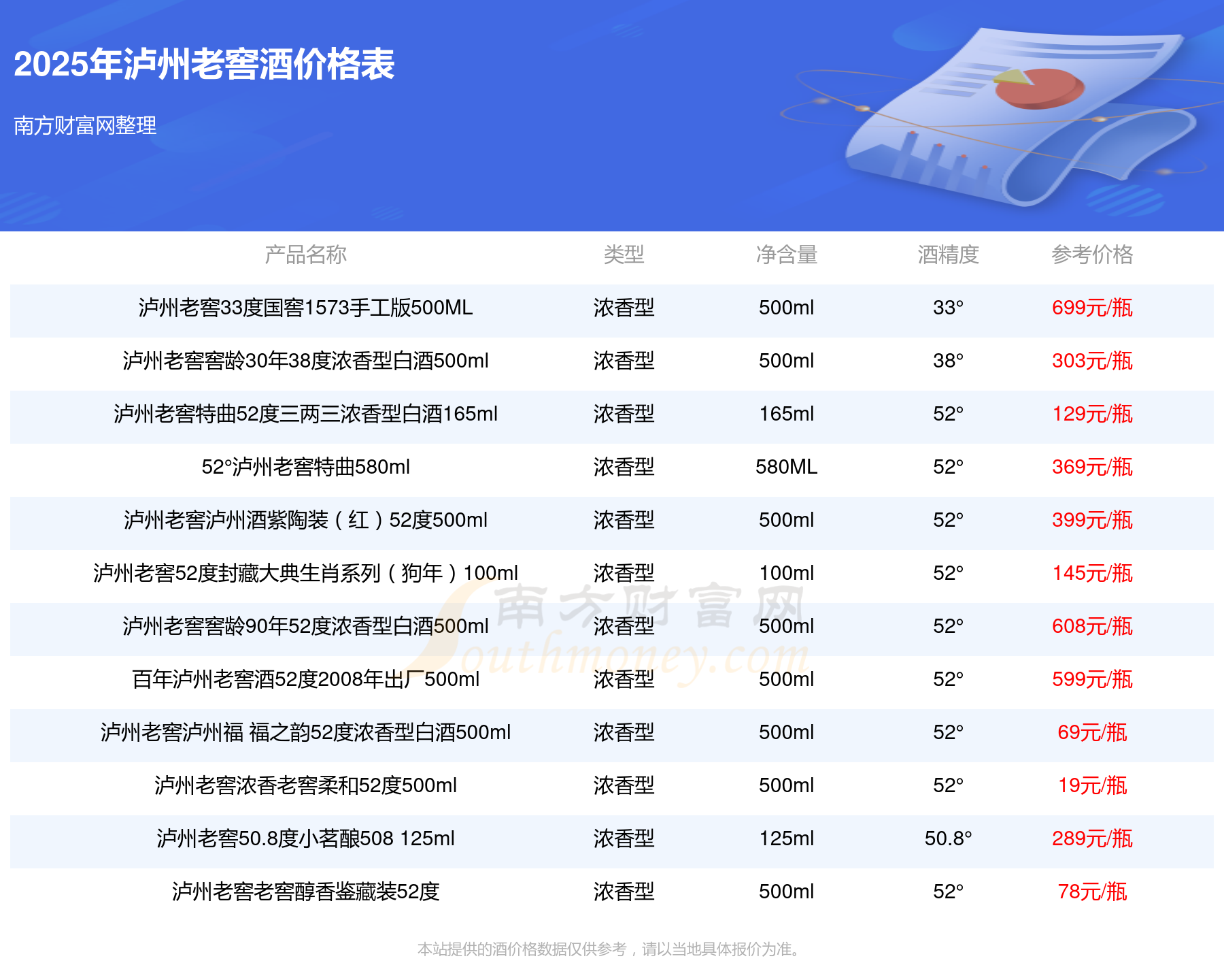 瀘州老窖酒最新價(jià)格2025:瀘州老窖國(guó)窖1573春釀鼠兆豐年E 55度參考價(jià)17999元/瓶、瀘州老窖國(guó)窖1573生命中的那壇酒55度014參考價(jià)9999元/瓶、瀘州老窖國(guó)窖1573春釀鼠兆豐年A 55度參考價(jià)5088元/瓶、瀘州老窖國(guó)窖1573生命中的那壇酒55度013濃香型白酒1000ml參考價(jià)4988元/瓶。