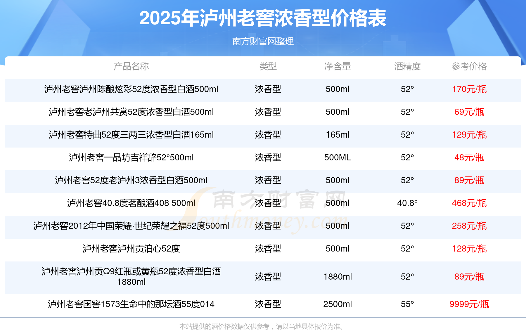 瀘州老窖濃香型酒最新價(jià)格2025:瀘州老窖國(guó)窖1573春釀鼠兆豐年E 55度參考價(jià)17999元/瓶、瀘州老窖國(guó)窖1573生命中的那壇酒55度014參考價(jià)9999元/瓶、瀘州老窖國(guó)窖1573春釀鼠兆豐年A 55度參考價(jià)5088元/瓶、瀘州老窖國(guó)窖1573生命中的那壇酒55度013濃香型白酒1000ml參考價(jià)4988元/瓶、瀘州老窖國(guó)窖1573生命中的那壇酒55度009 1000ml參考價(jià)4288元/瓶。