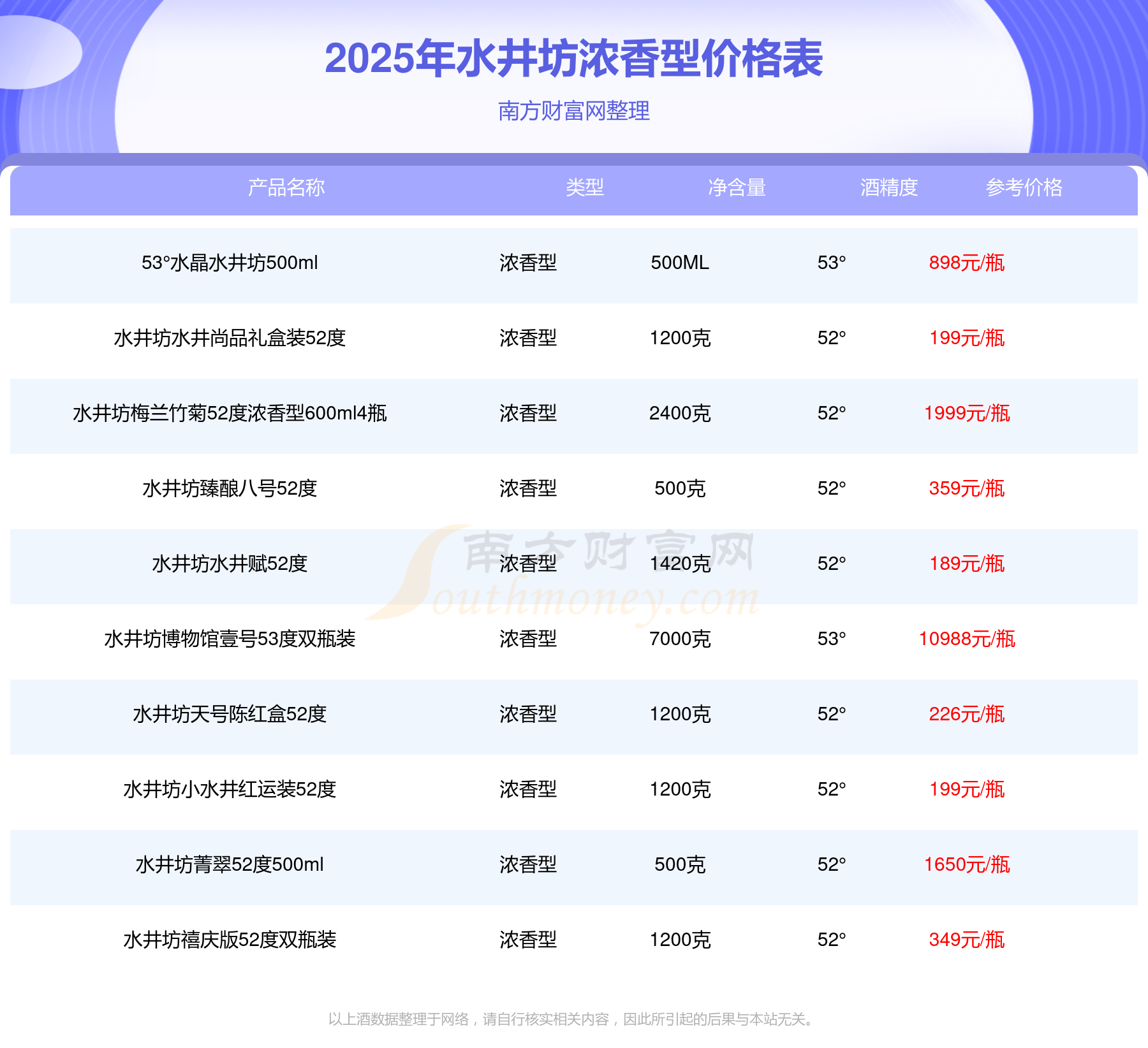 2025年,水井坊大壇收藏級原漿天球瓶66度、水井坊博物館壹號53度雙瓶裝、53°水井坊公元十三600ml、水井坊梅蘭竹菊52度濃香型600ml4瓶、水井坊菁翠52度500ml、井臺珍藏版龍53度1000ml單瓶裝、井臺珍藏版鳳53度1000ml單瓶裝等水井坊濃香型酒參考價格如下:水井坊大壇收藏級原漿天球瓶66度參考價13999元、水井坊博物館壹號53度雙瓶裝參考價10988元、53°水井坊公元十三600ml參考價2580元、水井坊梅蘭竹菊52度濃香型600ml4瓶參考價1999元、水井坊菁翠52度500ml參考價1650元、井臺珍藏版龍53度1000ml單瓶裝參考價1298元、井臺珍藏版鳳53度1000ml單瓶裝參考價1298元。