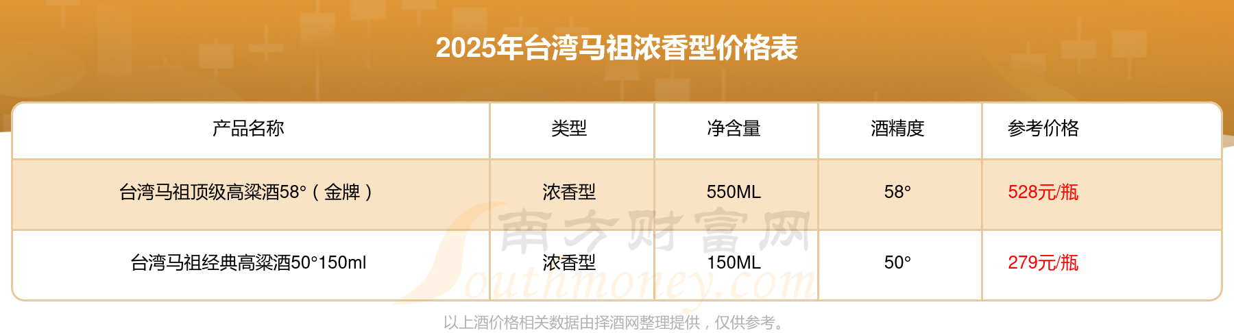 臺(tái)灣馬祖濃香型酒最新價(jià)格2025:臺(tái)灣馬祖頂級(jí)高粱酒58°(金牌)參考價(jià)528元/瓶、臺(tái)灣馬祖經(jīng)典高粱酒50°150ml參考價(jià)279元/瓶。