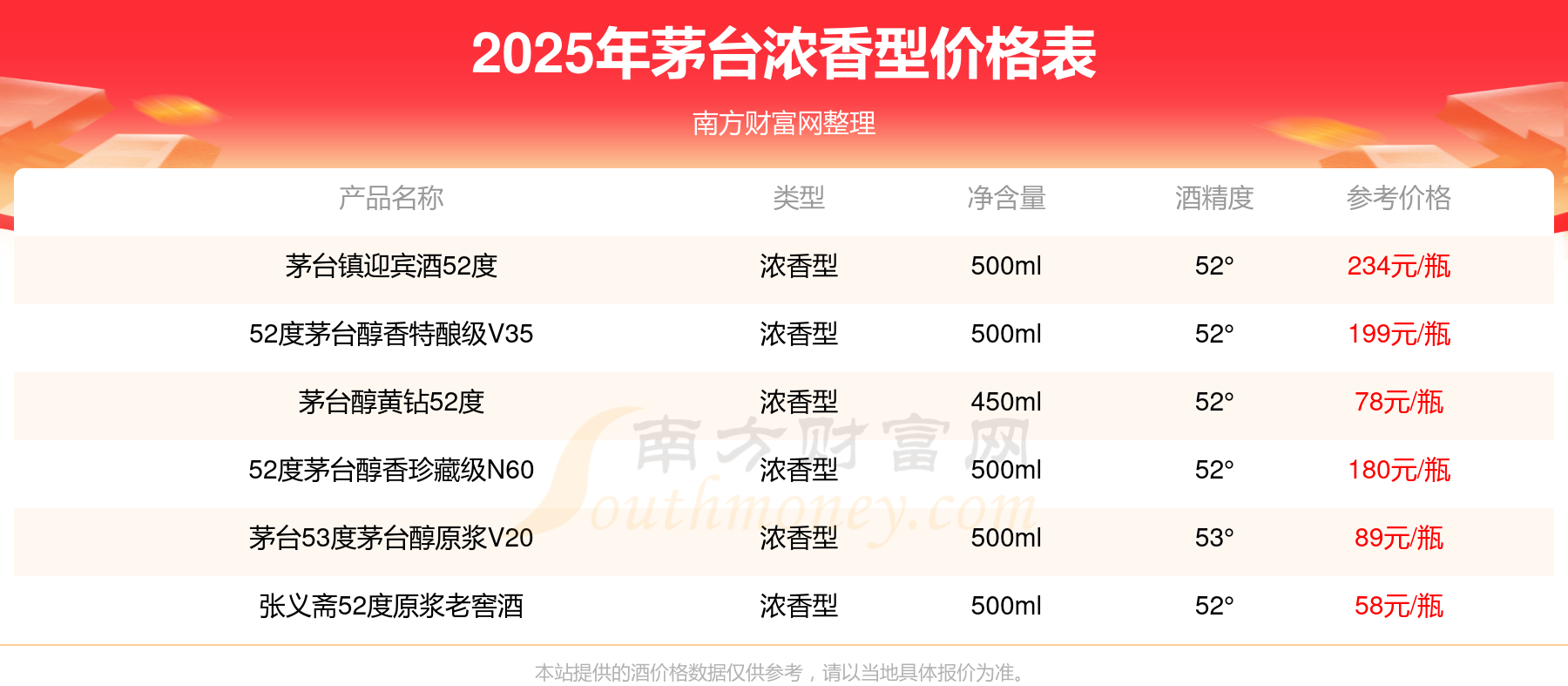 茅臺鎮(zhèn)迎賓酒52度參考價234元/瓶、52度茅臺醇香特釀級V35參考價199元/瓶、52度茅臺醇香珍藏級N60參考價180元/瓶、茅臺53度茅臺醇原漿V20參考價89元/瓶。