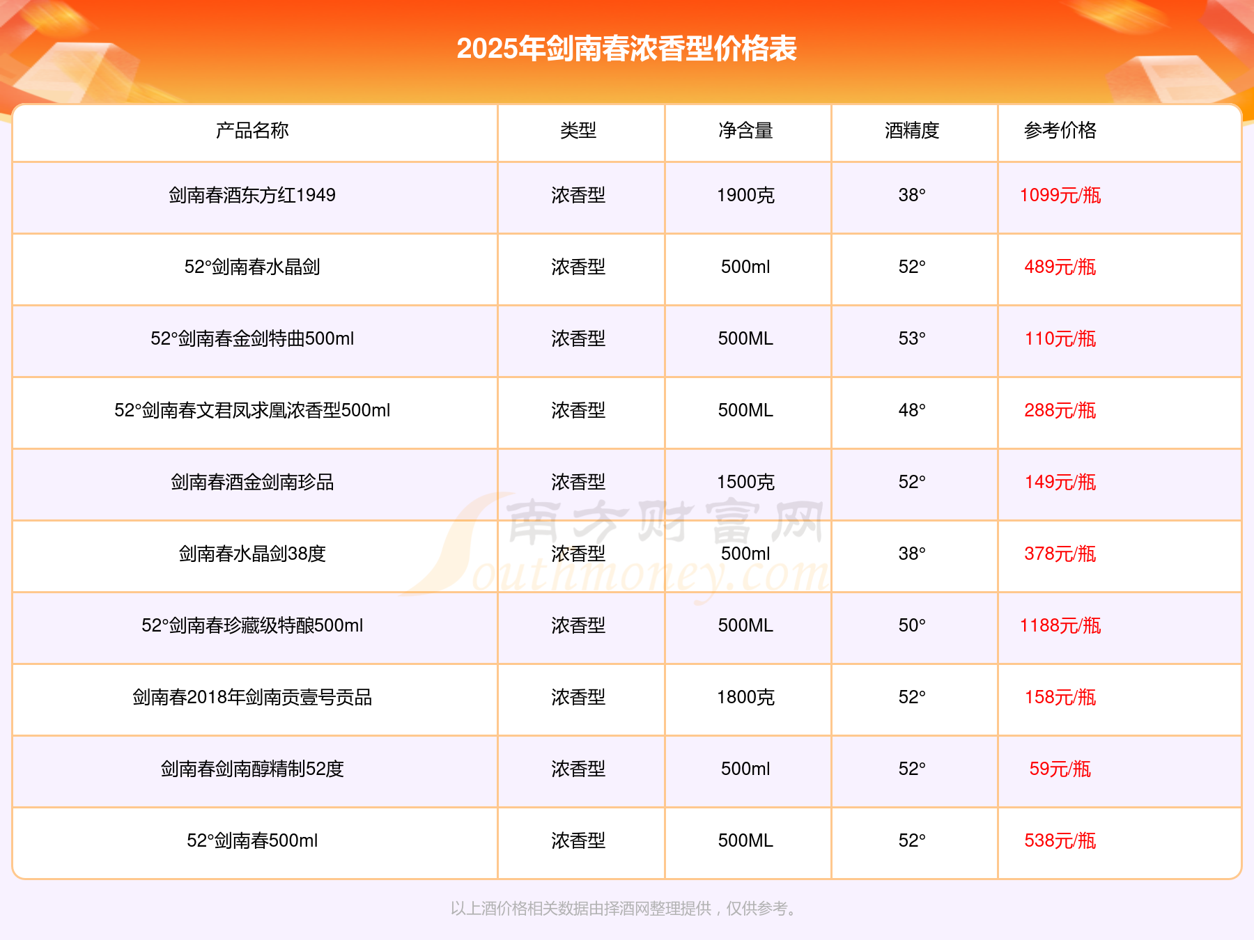 2025年劍南春濃香型酒劍南春鑒藏52度、52°劍南春珍藏級特釀500ml、劍南春酒東方紅1949、52°劍南春500ml、52°劍南春水晶劍、劍南春水晶劍38度等最新價格如下: