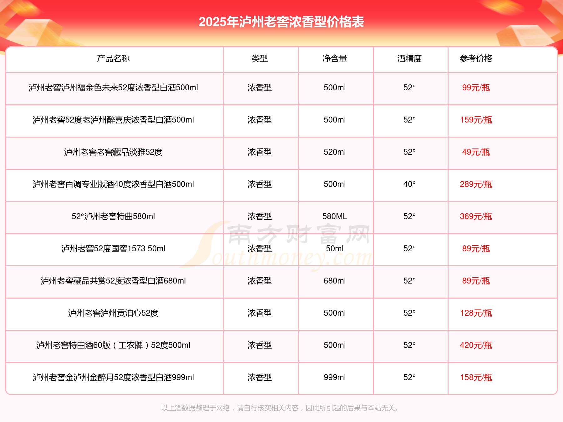 2025年,瀘州老窖國(guó)窖1573春釀鼠兆豐年E 55度、瀘州老窖國(guó)窖1573生命中的那壇酒55度014、瀘州老窖國(guó)窖1573春釀鼠兆豐年A 55度、瀘州老窖國(guó)窖1573生命中的那壇酒55度013濃香型白酒1000ml、瀘州老窖國(guó)窖1573生命中的那壇酒55度009 1000ml、瀘州老窖國(guó)窖1573中國(guó)品味52度濃香型白酒500ml、瀘州老窖國(guó)窖1573許燎源概念作品58度濃香型白酒1000ml等瀘州老窖濃香型酒價(jià)格如下:瀘州老窖國(guó)窖1573春釀鼠兆豐年E 55度參考價(jià)17999元/瓶、瀘州老窖國(guó)窖1573生命中的那壇酒55度014參考價(jià)9999元/瓶、瀘州老窖國(guó)窖1573春釀鼠兆豐年A 55度參考價(jià)5088元/瓶、瀘州老窖國(guó)窖1573生命中的那壇酒55度013濃香型白酒1000ml參考價(jià)4988元/瓶、瀘州老窖國(guó)窖1573生命中的那壇酒55度009 1000ml參考價(jià)4288元/瓶、瀘州老窖國(guó)窖1573中國(guó)品味52度濃香型白酒500ml參考價(jià)2888元/瓶、瀘州老窖國(guó)窖1573許燎源概念作品58度濃香型白酒1000ml參考價(jià)2680元/瓶。