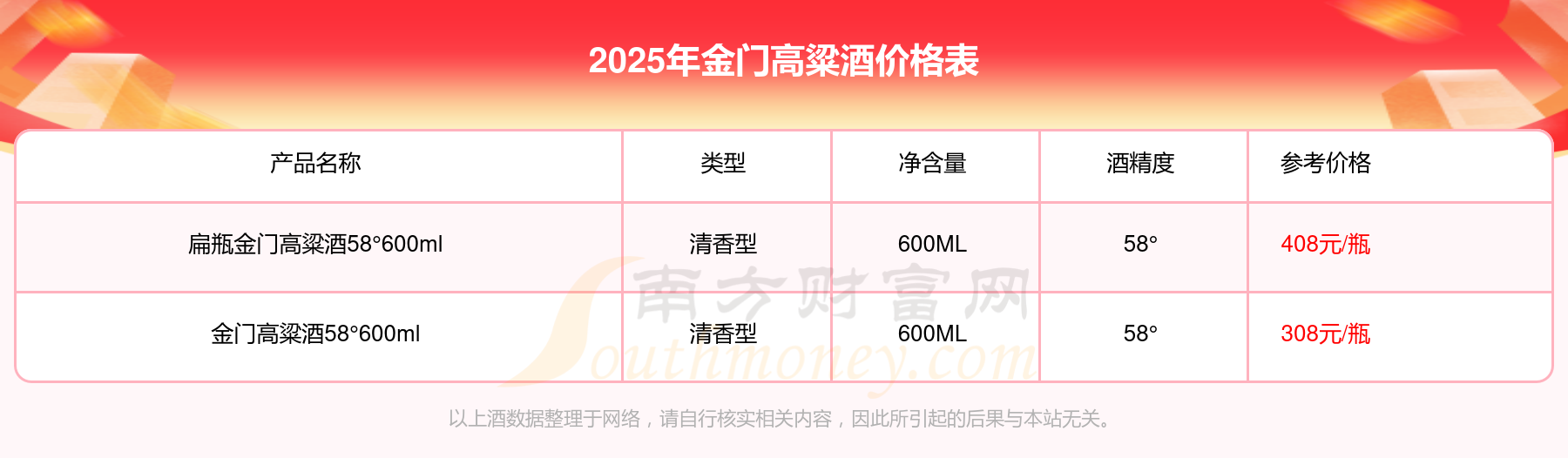 金門高粱酒最新價(jià)格2025:扁瓶金門高粱酒58°600ml參考價(jià)408元/瓶、金門高粱酒58°600ml參考價(jià)308元/瓶。