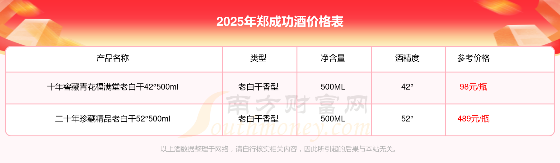 2025年,二十年珍藏精品老白干52°500ml、十年窖藏青花福滿堂老白干42°500ml等鄭成功酒價(jià)格如下:二十年珍藏精品老白干52°500ml參考價(jià)489元/瓶、十年窖藏青花福滿堂老白干42°500ml參考價(jià)98元/瓶。