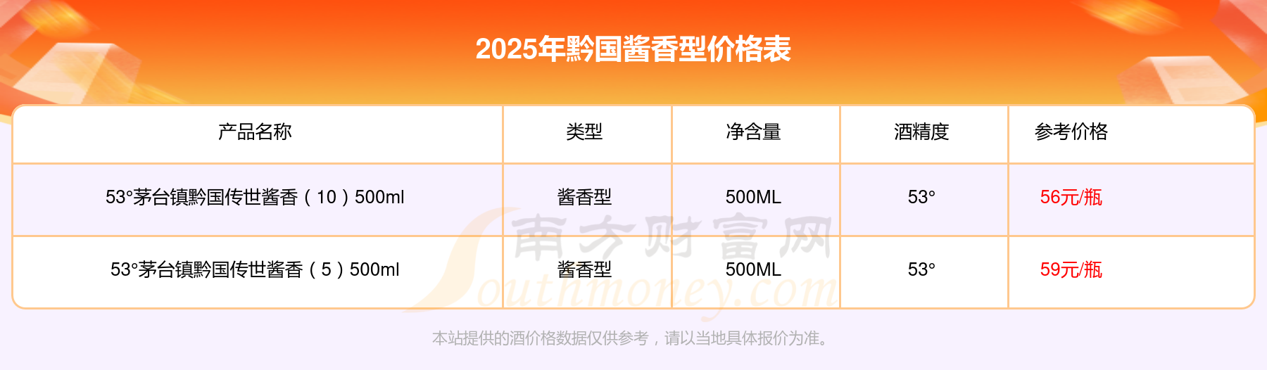 2025年,53°茅臺鎮(zhèn)黔國傳世醬香(5)500ml、53°茅臺鎮(zhèn)黔國傳世醬香(10)500ml等黔國醬香型酒參考價格如下:53°茅臺鎮(zhèn)黔國傳世醬香(5)500ml參考價59元、53°茅臺鎮(zhèn)黔國傳世醬香(10)500ml參考價56元。