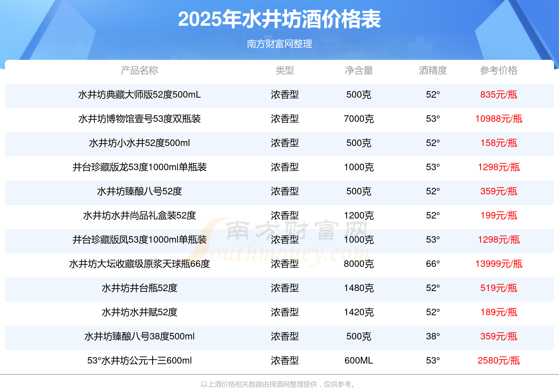 水井坊大壇收藏級(jí)原漿天球瓶66度參考價(jià)13999元/瓶、水井坊博物館壹號(hào)53度雙瓶裝參考價(jià)10988元/瓶、53°水井坊公元十三600ml參考價(jià)2580元/瓶、水井坊梅蘭竹菊52度濃香型600ml4瓶參考價(jià)1999元/瓶、水井坊菁翠52度500ml參考價(jià)1650元/瓶。