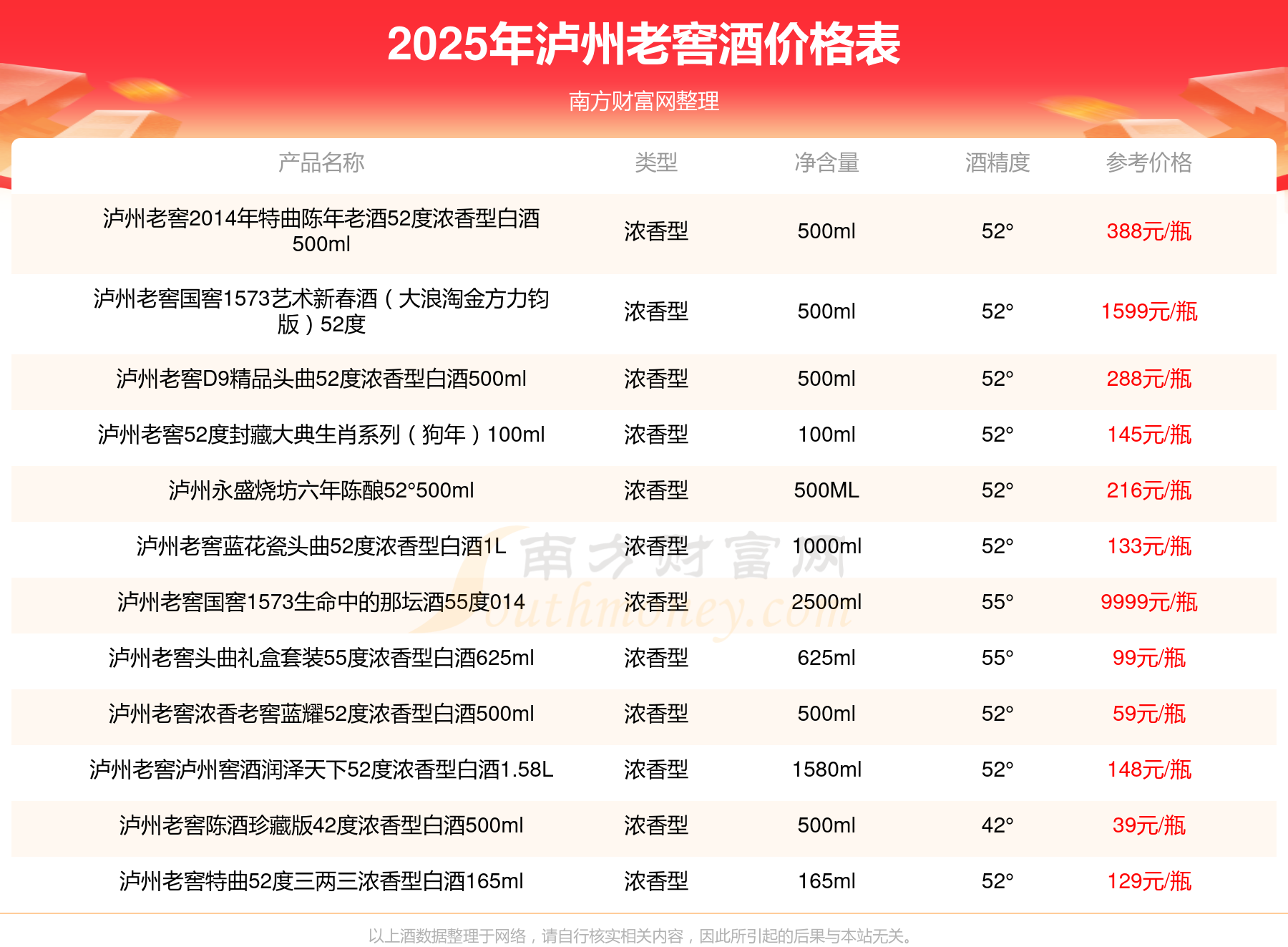2025瀘州老窖酒最新價(jià)格:瀘州老窖國窖1573春釀鼠兆豐年E 55度參考價(jià)17999元/瓶、瀘州老窖國窖1573生命中的那壇酒55度014參考價(jià)9999元/瓶、瀘州老窖國窖1573春釀鼠兆豐年A 55度參考價(jià)5088元/瓶、瀘州老窖國窖1573生命中的那壇酒55度013濃香型白酒1000ml參考價(jià)4988元/瓶、瀘州老窖國窖1573生命中的那壇酒55度009 1000ml參考價(jià)4288元/瓶、瀘州老窖國窖1573中國品味52度濃香型白酒500ml參考價(jià)2888元/瓶。