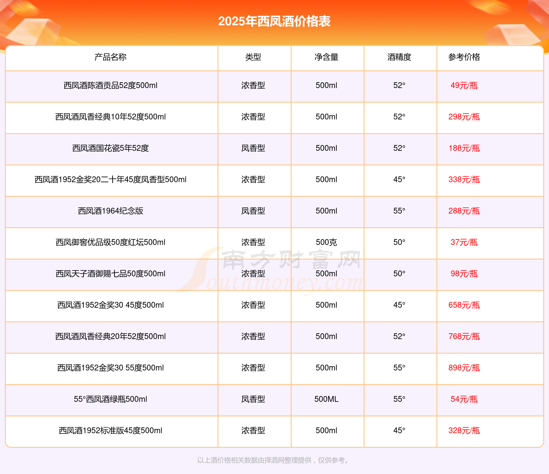 2025年西鳳酒西鳳酒 酒海私藏55度3000ml、西鳳酒1952金獎50 55度500ml、西鳳酒2013年產老酒鳳香經典30年52度500ml等最新價格如下: