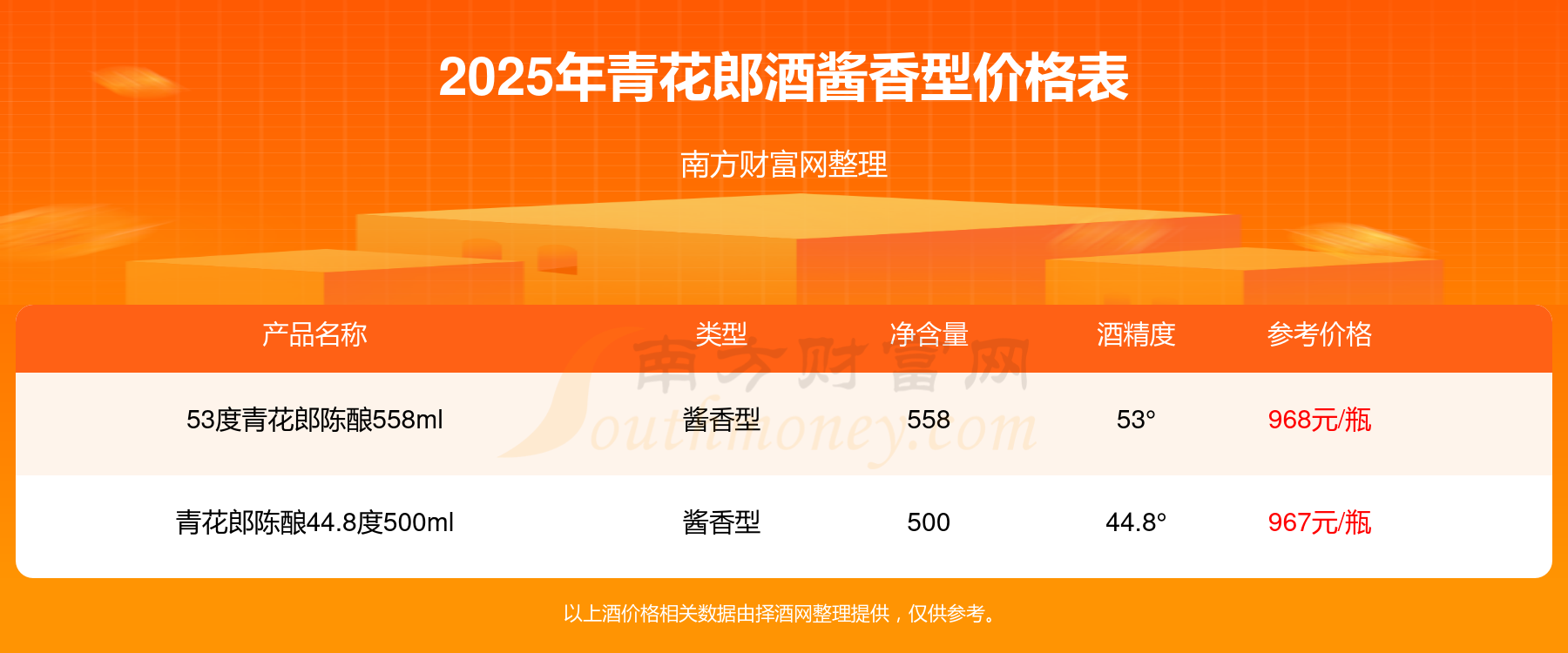 2025年,53度青花郎陳釀558ml、青花郎陳釀44.8度500ml等青花郎酒醬香型酒價(jià)格如下: