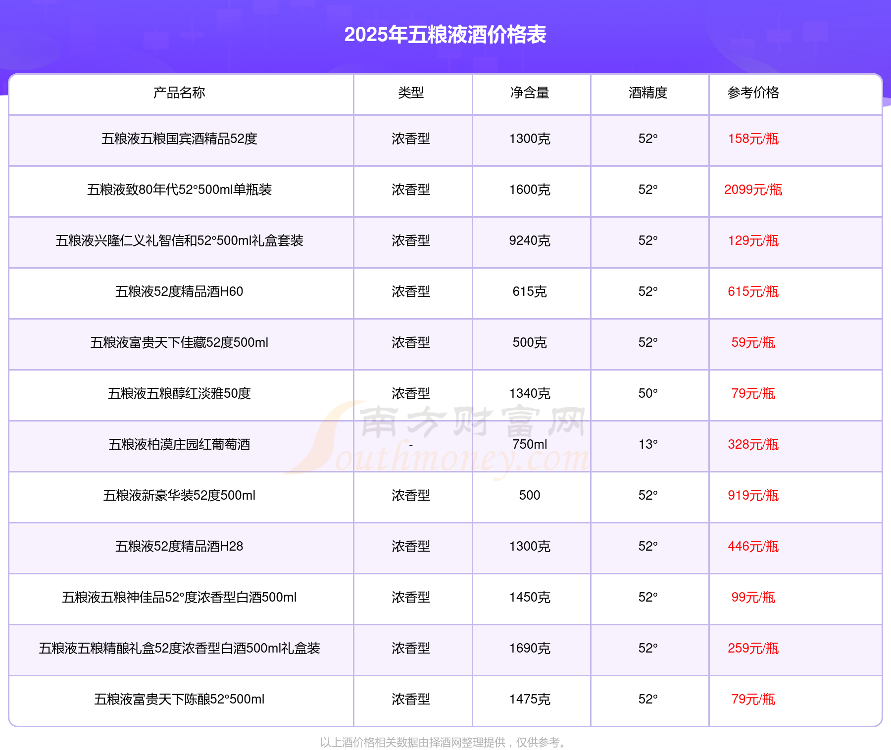 2025年,五糧液酒價格最高的是五糧液百年世博世紀榮耀紀念酒60°999ml,參考價26980元,最低的是五糧液干一杯小瓶46度,參考價16元,價格高低差為26964元。