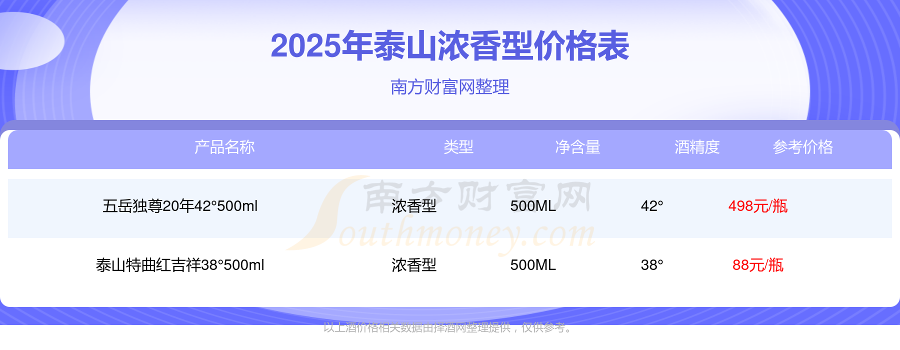 2025年,五岳獨(dú)尊20年42°500ml、泰山特曲紅吉祥38°500ml等泰山濃香型酒價(jià)格如下: