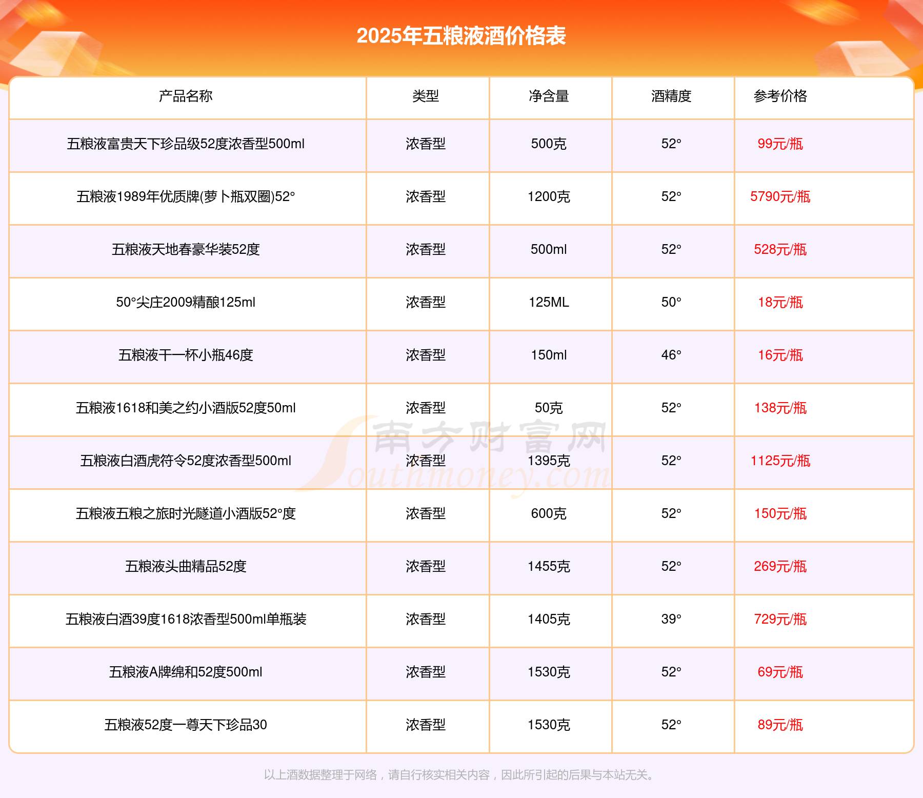 當(dāng)下五糧液酒價(jià)格最高的酒為五糧液百年世博世紀(jì)榮耀紀(jì)念酒60°999ml,參考價(jià)26980元/瓶,而五糧液酒價(jià)格最低的是五糧液干一杯小瓶46度,參考價(jià)16元/瓶,價(jià)格高低差為26964元/瓶。