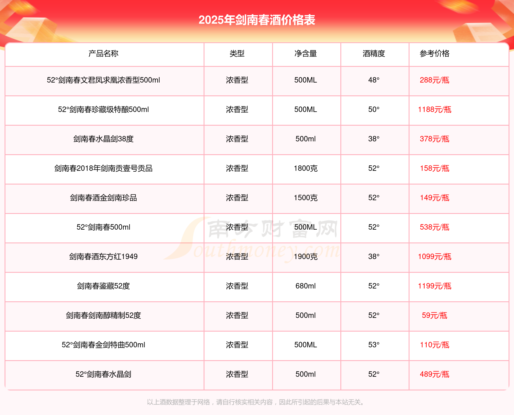 劍南春酒最新價(jià)格2025:劍南春鑒藏52度參考價(jià)1199元/瓶、52°劍南春珍藏級(jí)特釀500ml參考價(jià)1188元/瓶、劍南春酒東方紅1949參考價(jià)1099元/瓶、52°劍南春500ml參考價(jià)538元/瓶、52°劍南春水晶劍參考價(jià)489元/瓶、劍南春水晶劍38度參考價(jià)378元/瓶。