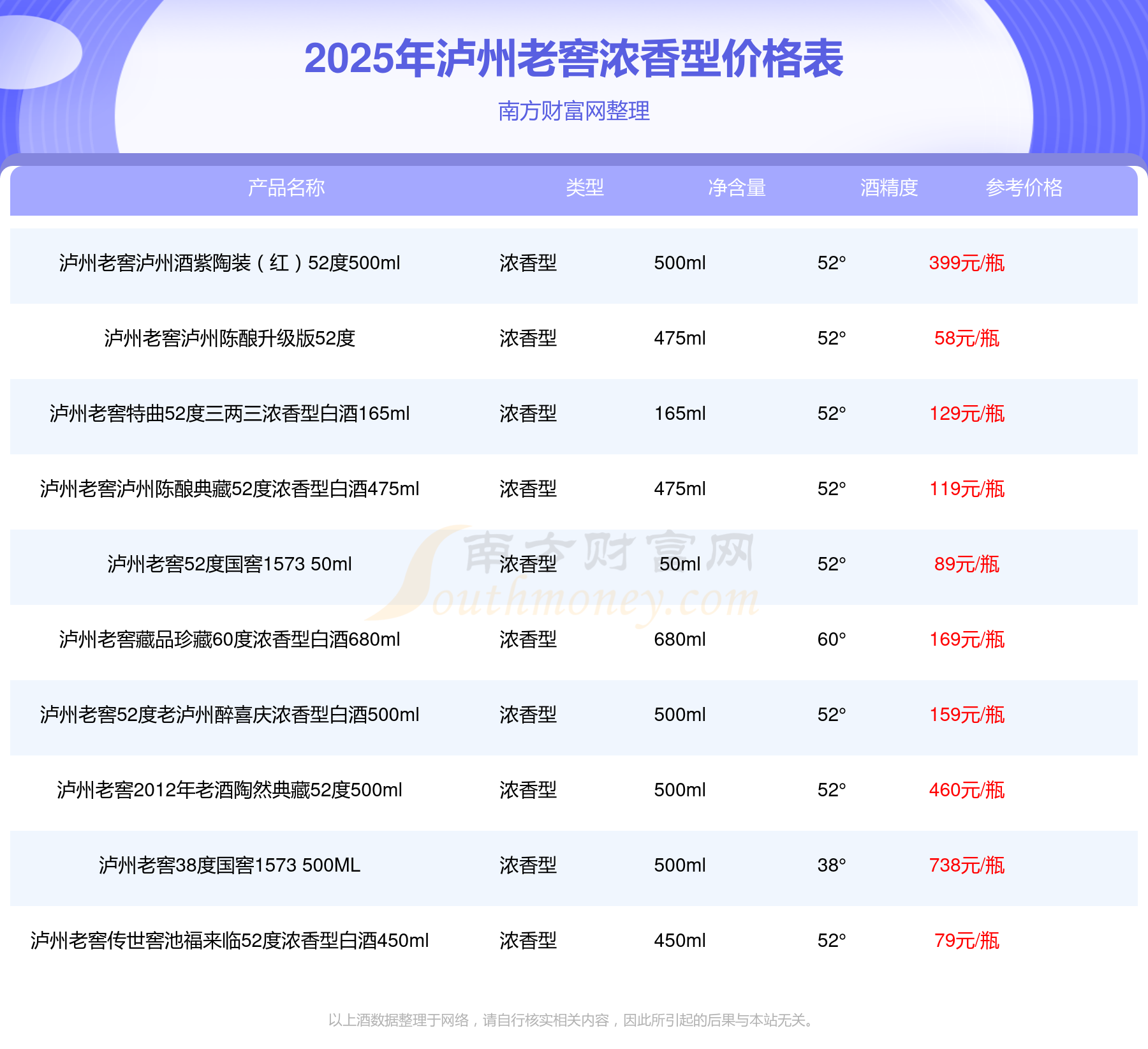 2025瀘州老窖濃香型酒最新價(jià)格:瀘州老窖國窖1573春釀鼠兆豐年E 55度參考價(jià)17999元/瓶、瀘州老窖國窖1573生命中的那壇酒55度014參考價(jià)9999元/瓶、瀘州老窖國窖1573春釀鼠兆豐年A 55度參考價(jià)5088元/瓶、瀘州老窖國窖1573生命中的那壇酒55度013濃香型白酒1000ml參考價(jià)4988元/瓶、瀘州老窖國窖1573生命中的那壇酒55度009 1000ml參考價(jià)4288元/瓶。
