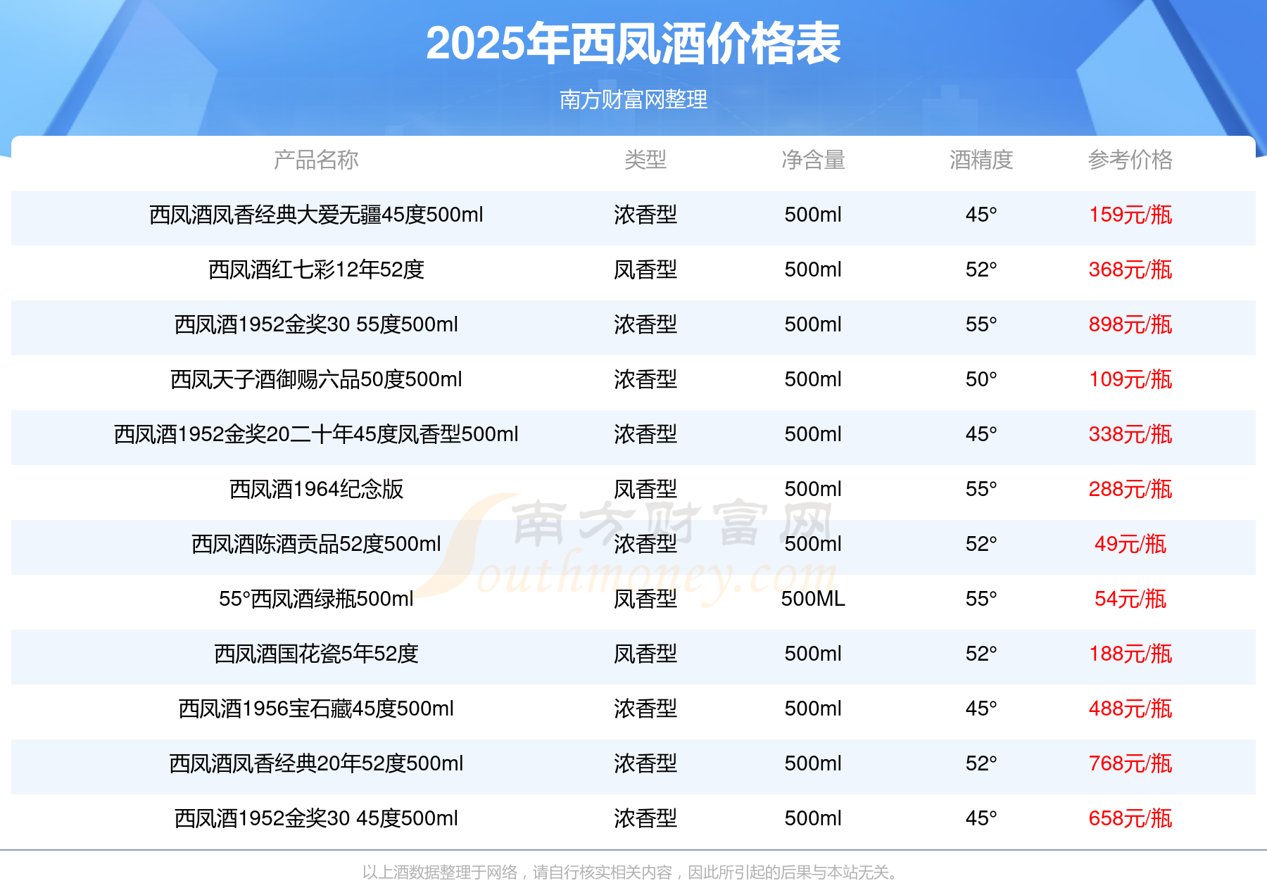 西鳳酒 酒海私藏55度3000ml參考價(jià)8880元/瓶、西鳳酒1952金獎(jiǎng)50 55度500ml參考價(jià)2380元/瓶、西鳳酒2013年產(chǎn)老酒鳳香經(jīng)典30年52度500ml參考價(jià)1280元/瓶、西鳳酒1956鉆石藏45度500ml參考價(jià)980元/瓶、西鳳酒1952金獎(jiǎng)30 55度500ml參考價(jià)898元/瓶。