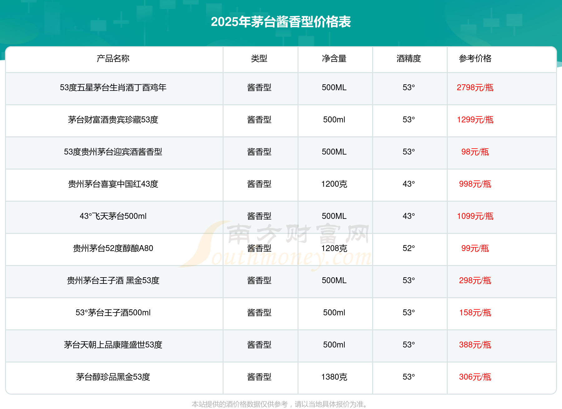 華茅鑒藏 醬香型白酒 3L 53°參考價8388元/瓶、53度五星茅臺生肖酒丁酉雞年參考價2798元/瓶、貴州茅臺己亥豬年生肖酒53°500ml參考價2699元/瓶、53度五星茅臺生肖酒戊戌狗年參考價2698元/瓶、飛天茅臺53°500ml(2015年)參考價2199元/瓶。