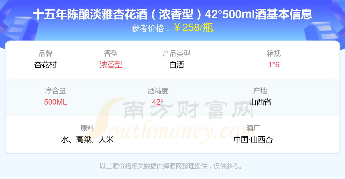 十五年陳釀淡雅杏花酒(濃香型)42°500ml基本信息