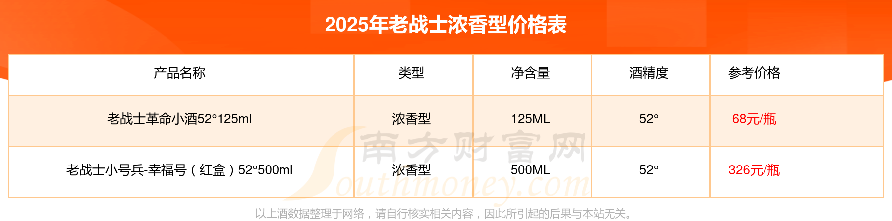 2025年,老戰(zhàn)士小號兵-幸福號(紅盒)52°500ml、老戰(zhàn)士革命小酒52°125ml等老戰(zhàn)士濃香型酒價格如下:老戰(zhàn)士小號兵-幸福號(紅盒)52°500ml參考價326元/瓶、老戰(zhàn)士革命小酒52°125ml參考價68元/瓶。