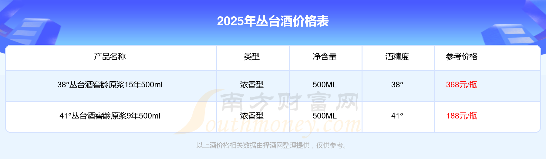 2025年叢臺(tái)酒38°叢臺(tái)酒窖齡原漿15年500ml、41°叢臺(tái)酒窖齡原漿9年500ml等最新價(jià)格如下: