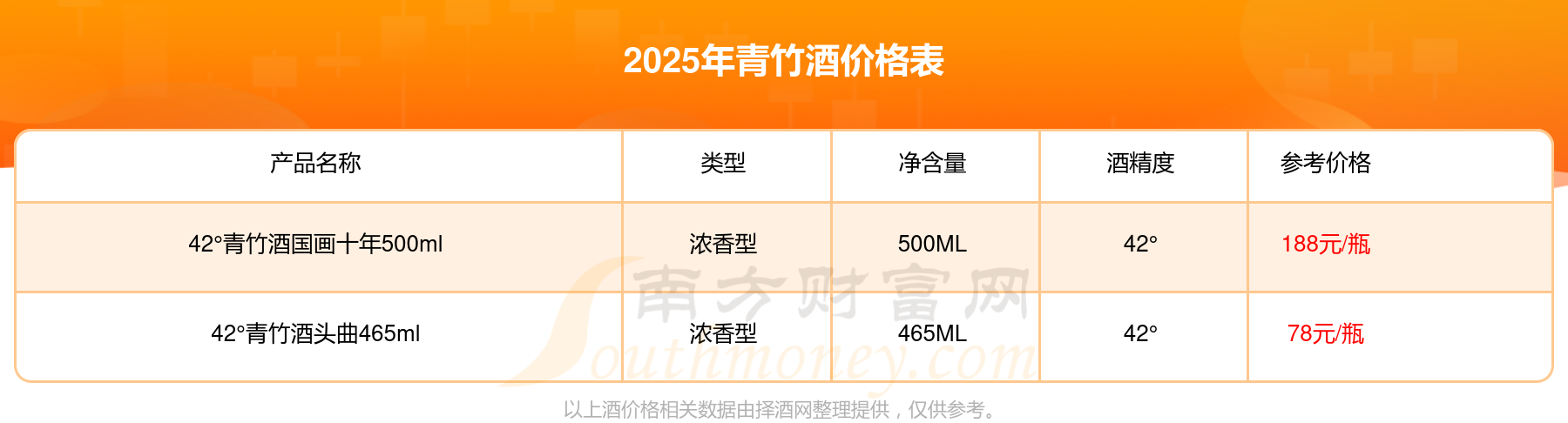 2025年,42°青竹酒國畫十年500ml、42°青竹酒頭曲465ml等青竹酒價格如下: