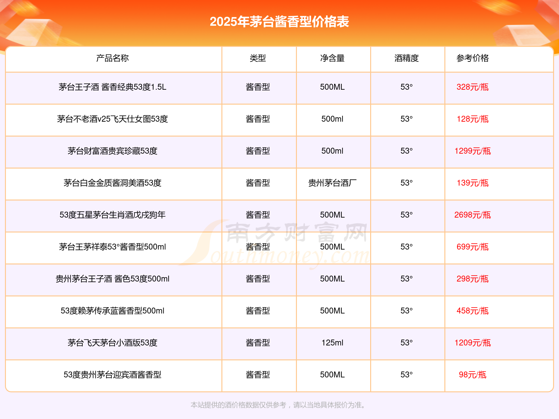 2025年,華茅鑒藏 醬香型白酒 3L 53°、53度五星茅臺(tái)生肖酒丁酉雞年、貴州茅臺(tái)己亥豬年生肖酒53°500ml、53度五星茅臺(tái)生肖酒戊戌狗年、飛天茅臺(tái)53°500ml(2015年)、茅臺(tái)王子酒己亥豬年生肖紀(jì)念酒53度2.5L、茅臺(tái)1935醬香型53度等茅臺(tái)醬香型酒參考價(jià)格如下:華茅鑒藏 醬香型白酒 3L 53°參考價(jià)8388元、53度五星茅臺(tái)生肖酒丁酉雞年參考價(jià)2798元、貴州茅臺(tái)己亥豬年生肖酒53°500ml參考價(jià)2699元、53度五星茅臺(tái)生肖酒戊戌狗年參考價(jià)2698元、飛天茅臺(tái)53°500ml(2015年)參考價(jià)2199元、茅臺(tái)王子酒己亥豬年生肖紀(jì)念酒53度2.5L參考價(jià)2099元、茅臺(tái)1935醬香型53度參考價(jià)1799元。