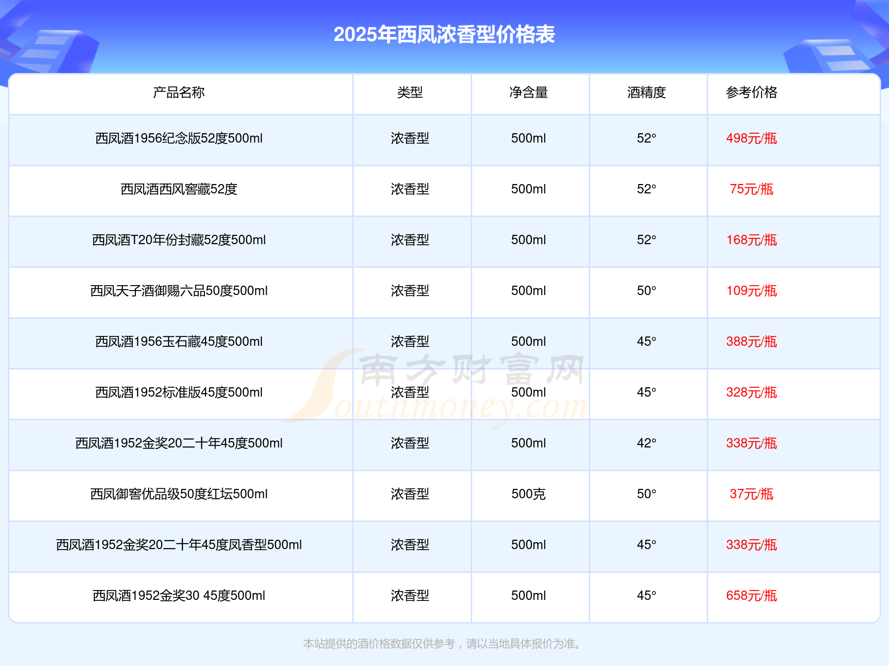 西鳳濃香型酒最新價(jià)格2025:西鳳酒 酒海私藏55度3000ml參考價(jià)8880元/瓶、西鳳酒1952金獎(jiǎng)50 55度500ml參考價(jià)2380元/瓶、西鳳酒2013年產(chǎn)老酒鳳香經(jīng)典30年52度500ml參考價(jià)1280元/瓶、西鳳酒1952金獎(jiǎng)30 55度500ml參考價(jià)898元/瓶、西鳳酒鳳香經(jīng)典20年52度500ml參考價(jià)768元/瓶。