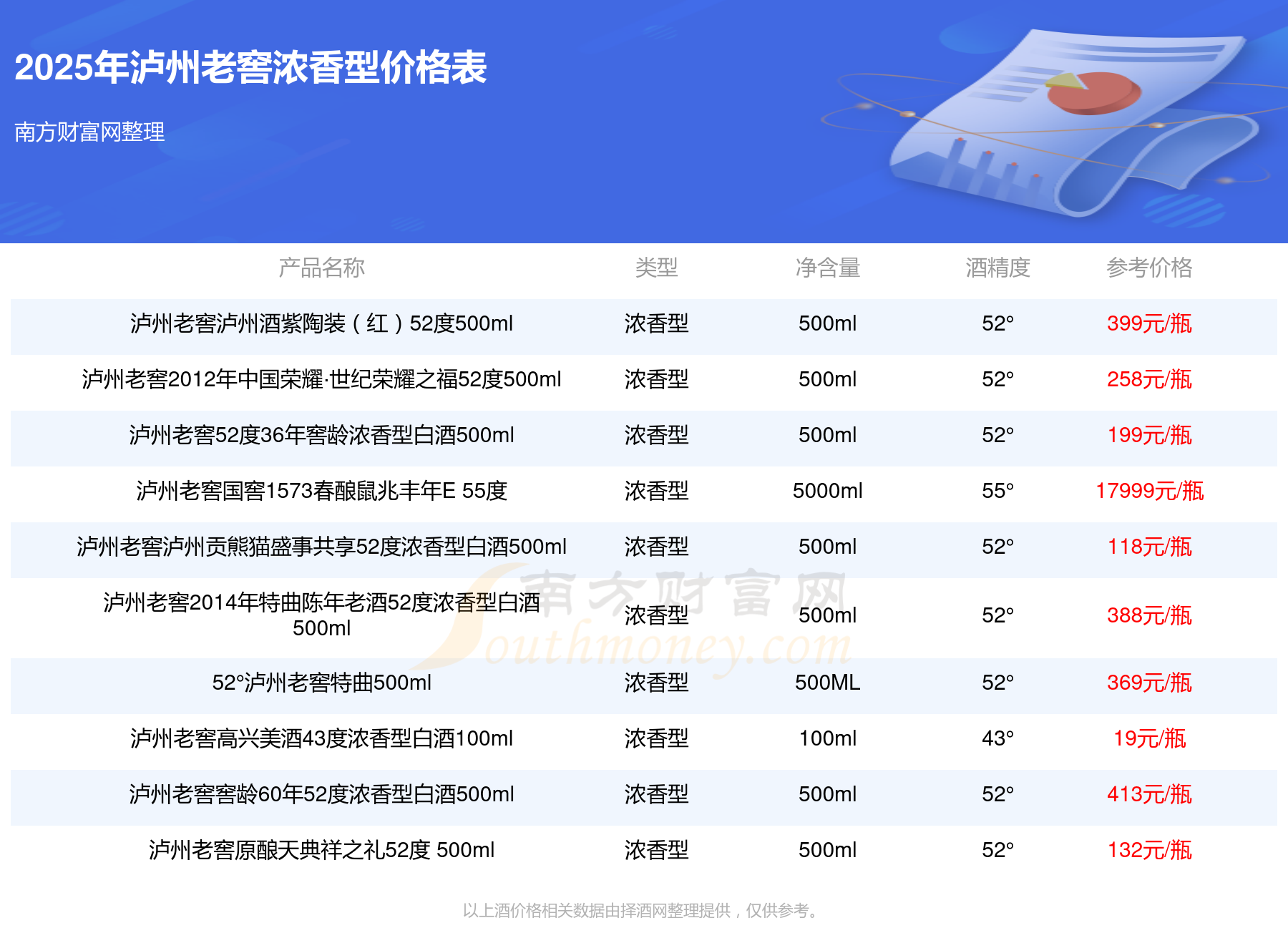 2025年,瀘州老窖國窖1573春釀鼠兆豐年E 55度、瀘州老窖國窖1573生命中的那壇酒55度014、瀘州老窖國窖1573春釀鼠兆豐年A 55度等瀘州老窖濃香型酒價(jià)格如下: