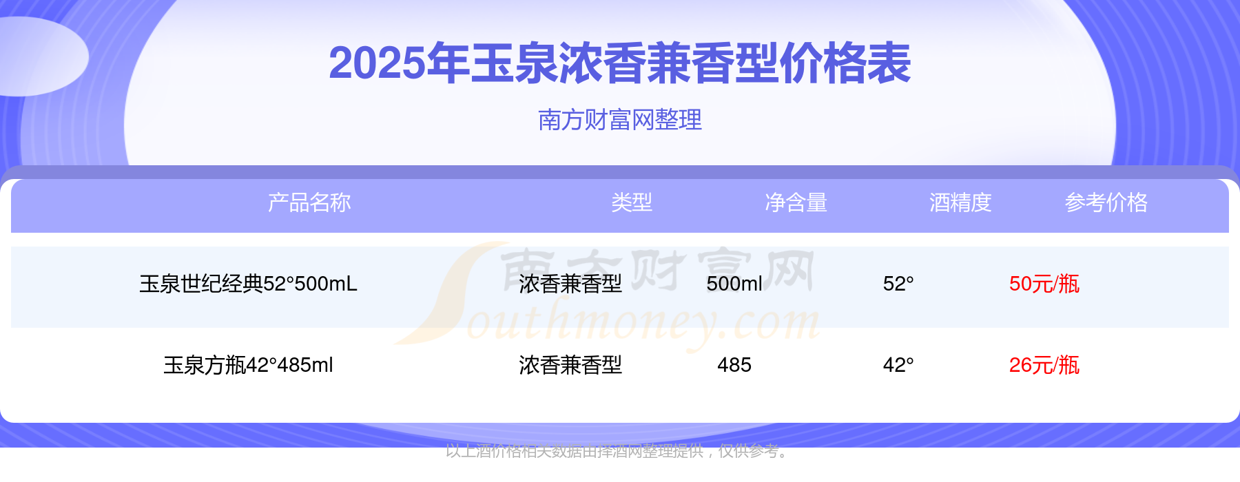 2025年玉泉濃香兼香型酒玉泉世紀(jì)經(jīng)典52°500mL、玉泉方瓶42°485ml等最新價格如下:玉泉世紀(jì)經(jīng)典52°500mL參考價50元/瓶、玉泉方瓶42°485ml參考價26元/瓶。