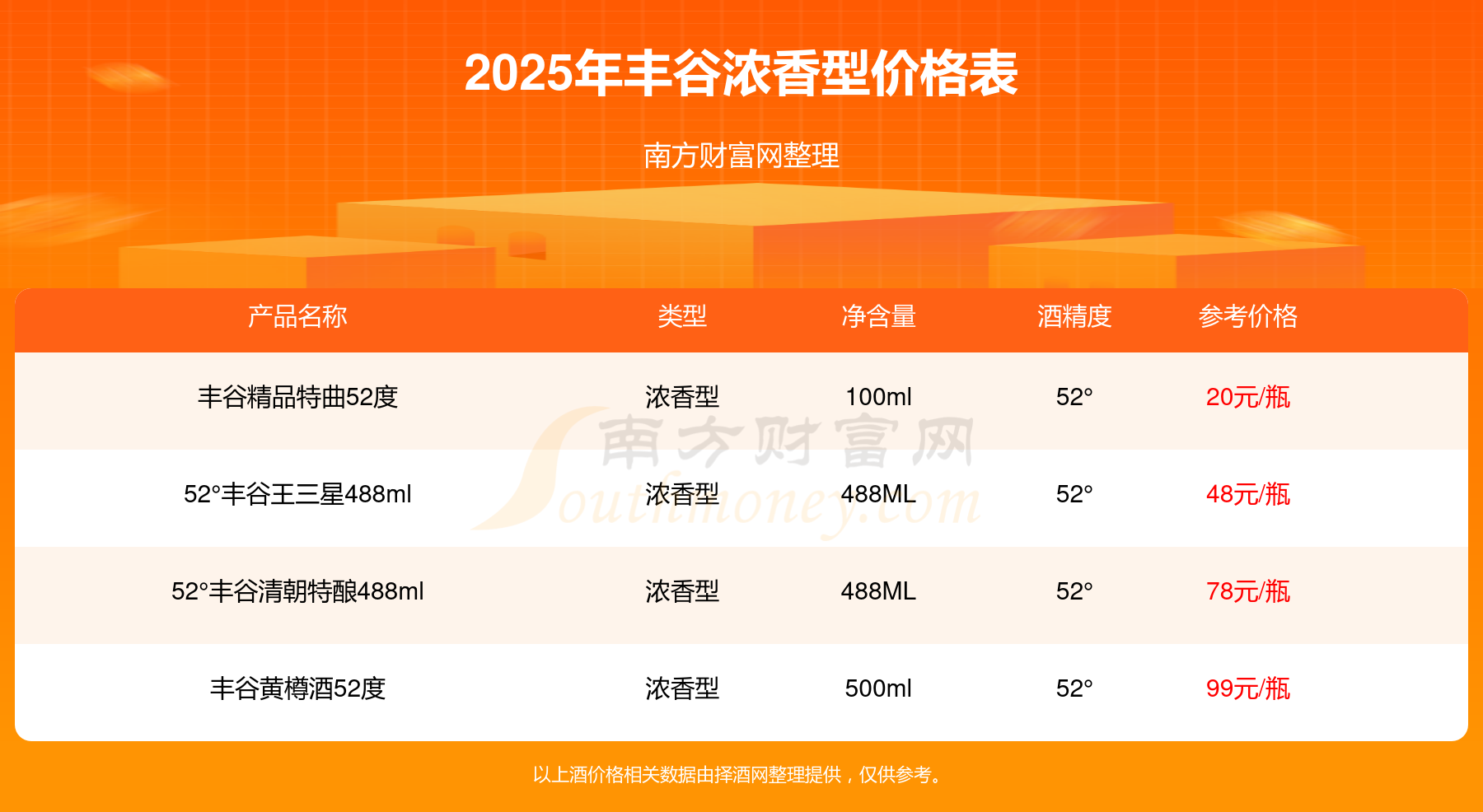 2025豐谷濃香型酒最新價(jià)格:豐谷黃樽酒52度參考價(jià)99元/瓶、52°豐谷清朝特釀488ml參考價(jià)78元/瓶、52°豐谷王三星488ml參考價(jià)48元/瓶。