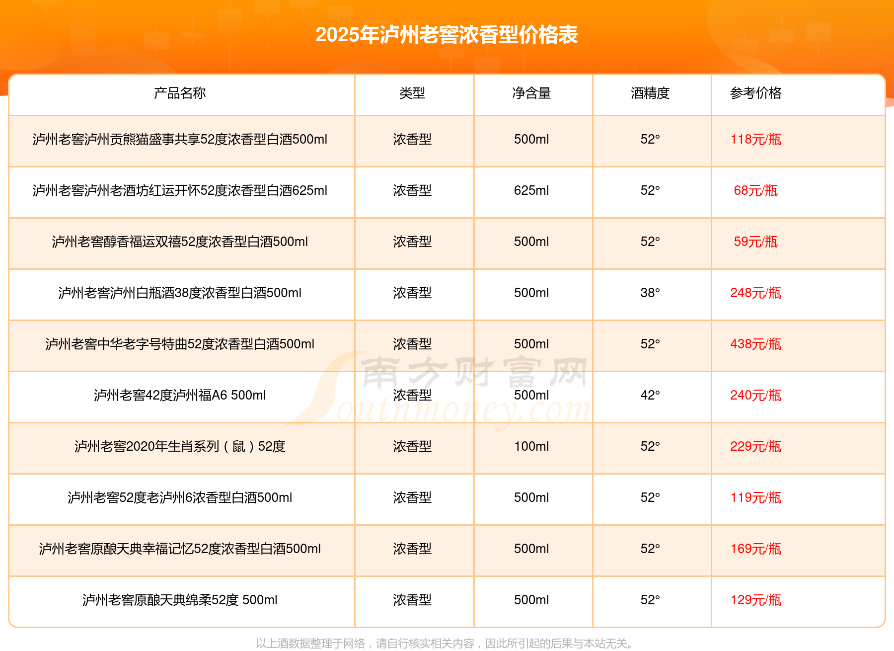 2025瀘州老窖濃香型酒最新價格:瀘州老窖國窖1573春釀鼠兆豐年E 55度參考價17999元/瓶、瀘州老窖國窖1573生命中的那壇酒55度014參考價9999元/瓶、瀘州老窖國窖1573春釀鼠兆豐年A 55度參考價5088元/瓶、瀘州老窖國窖1573生命中的那壇酒55度013濃香型白酒1000ml參考價4988元/瓶。