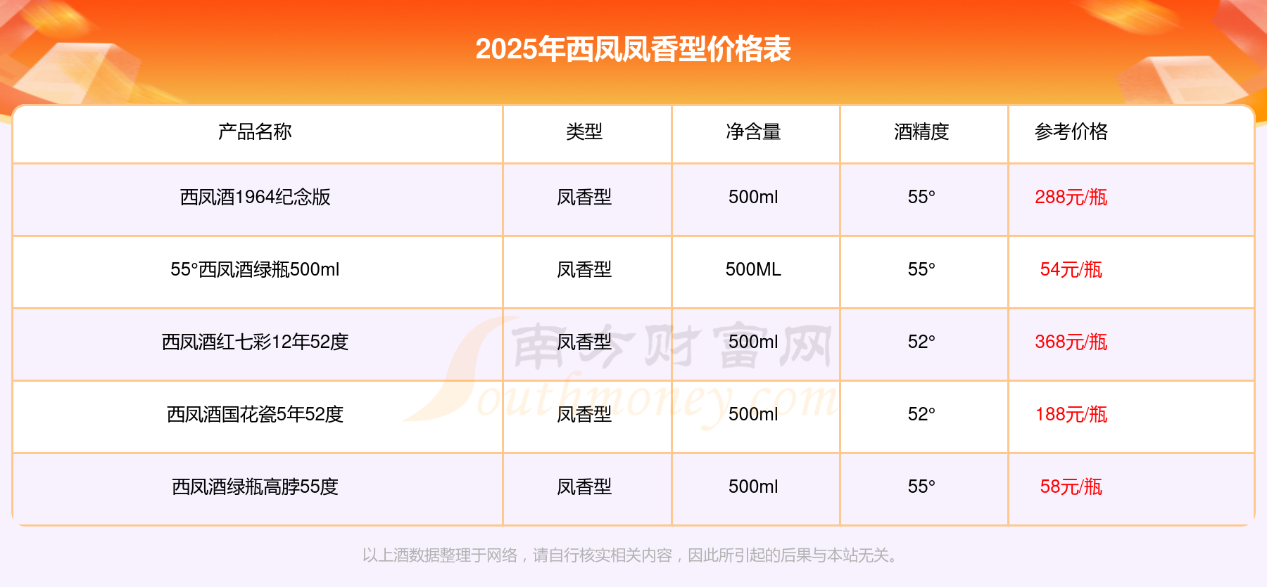 當(dāng)前西鳳鳳香型酒價(jià)格最高的酒為西鳳酒紅七彩12年52度,參考價(jià)368元/瓶,而西鳳鳳香型酒價(jià)格最低的是55°西鳳酒綠瓶500ml,參考價(jià)54元/瓶,價(jià)格高低差為314元/瓶。