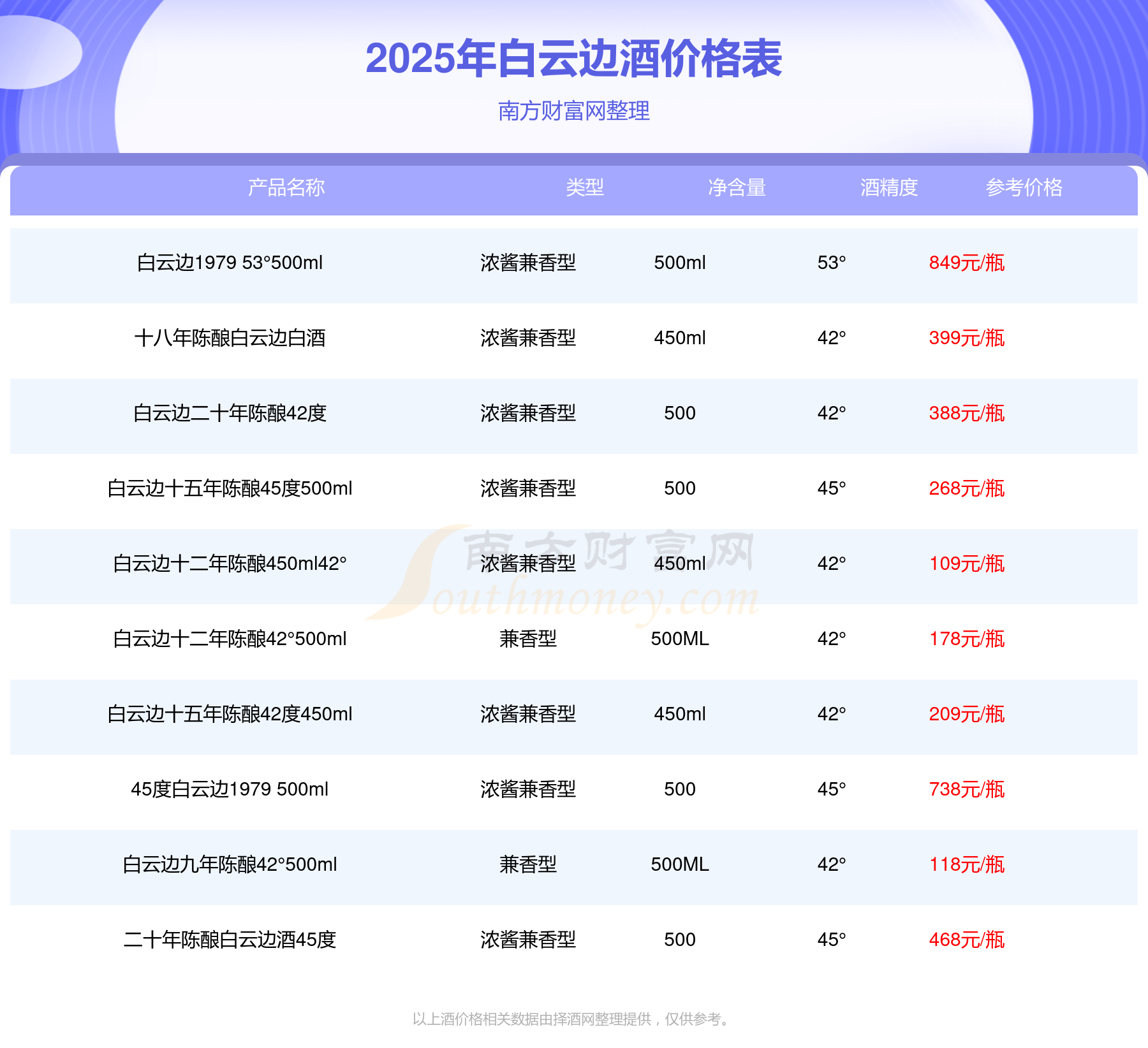 2025年,白云邊酒價(jià)格最高的是白云邊1979 53°500ml,參考價(jià)849元,最低的是白云邊十二年陳釀450ml42°,參考價(jià)109元,價(jià)格高低差為740元。
