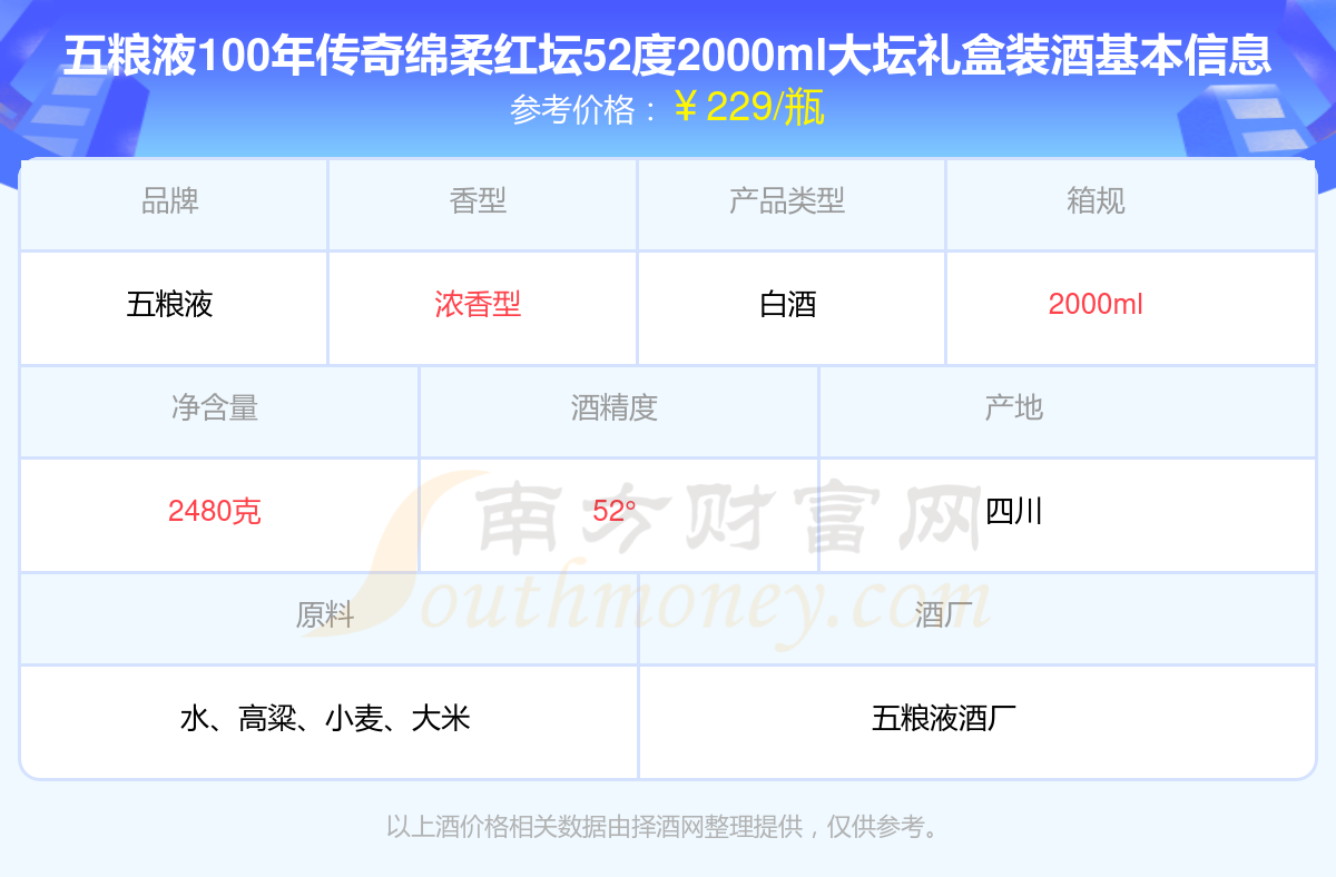 五糧液100年傳奇綿柔紅壇52度2000ml大壇禮盒裝基本信息