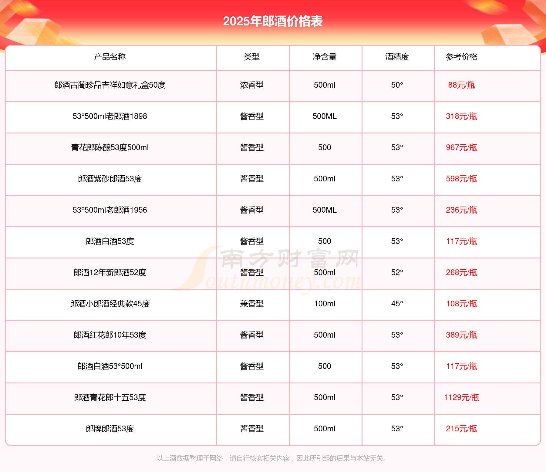 2025年,郎酒青花郎十五53度、青花郎陳釀53度500ml、郎酒紫砂郎酒53度、郎酒紅花郎10年53度、53°500ml老郎酒1898等郎酒價(jià)格如下: