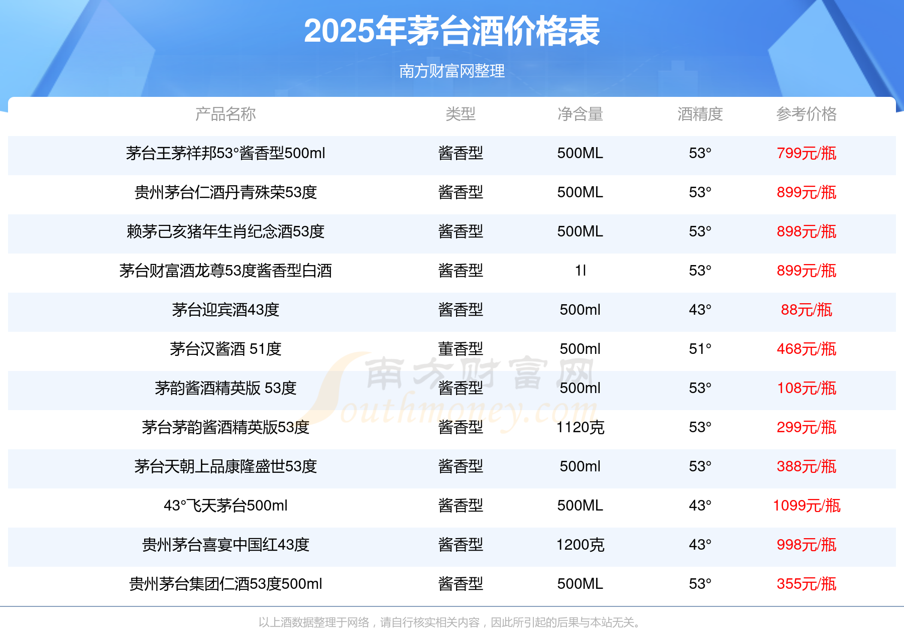 2025茅臺(tái)酒最新價(jià)格:華茅鑒藏 醬香型白酒 3L 53°參考價(jià)8388元/瓶、53度五星茅臺(tái)生肖酒丁酉雞年參考價(jià)2798元/瓶、貴州茅臺(tái)己亥豬年生肖酒53°500ml參考價(jià)2699元/瓶、53度五星茅臺(tái)生肖酒戊戌狗年參考價(jià)2698元/瓶、飛天茅臺(tái)53°500ml(2015年)參考價(jià)2199元/瓶、茅臺(tái)王子酒己亥豬年生肖紀(jì)念酒53度2.5L參考價(jià)2099元/瓶。