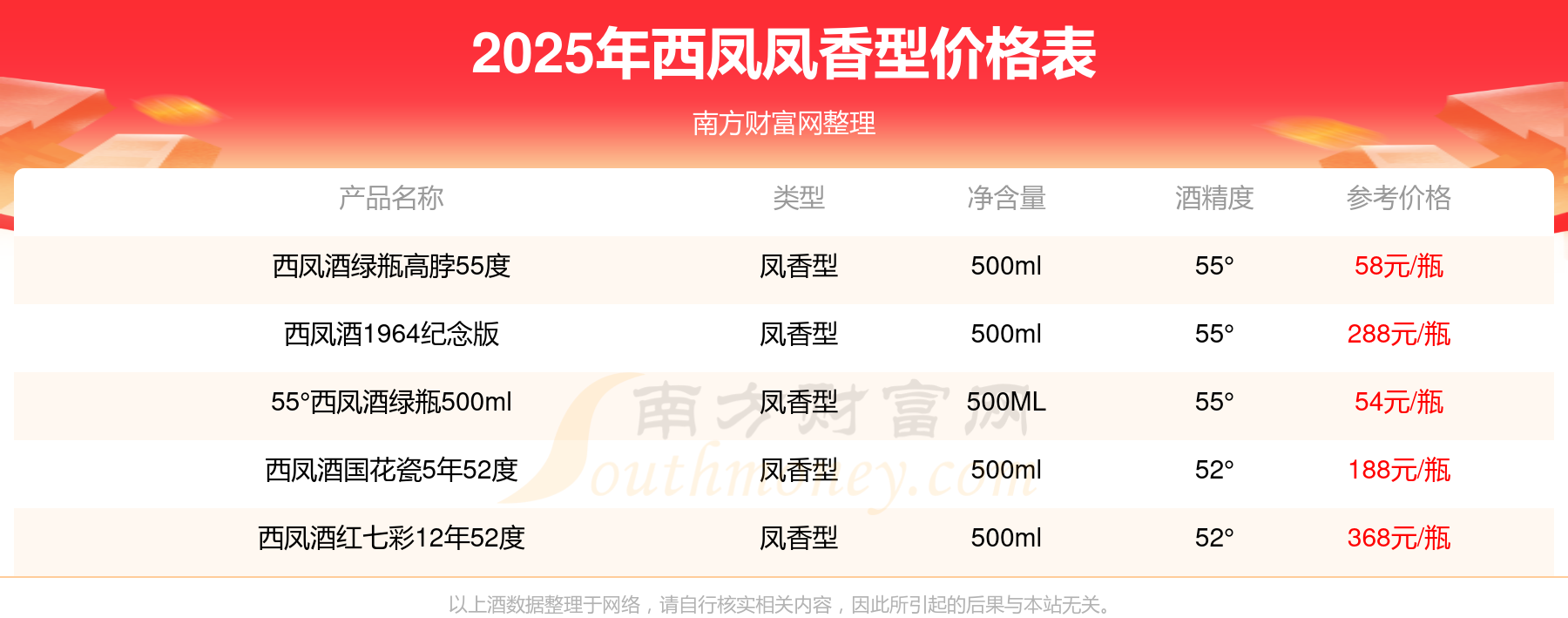 西鳳鳳香型酒最新價格2025:西鳳酒紅七彩12年52度參考價368元/瓶、西鳳酒1964紀(jì)念版參考價288元/瓶、西鳳酒國花瓷5年52度參考價188元/瓶、西鳳酒綠瓶高脖55度參考價58元/瓶、55°西鳳酒綠瓶500ml參考價54元/瓶。