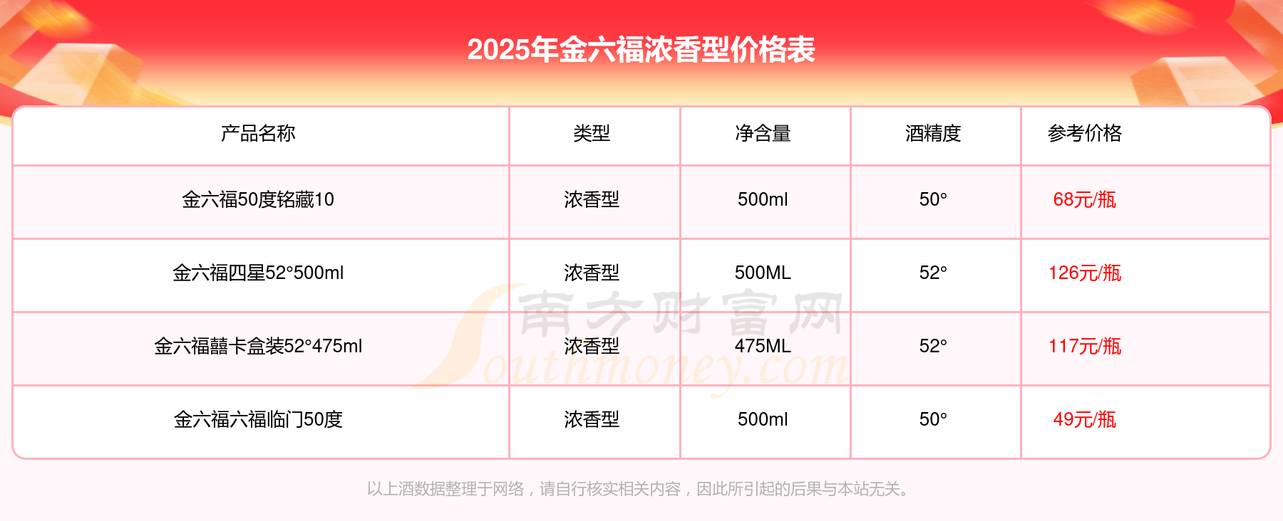金六福濃香型酒最新價(jià)格2025:金六福四星52°500ml參考價(jià)126元/瓶、金六福囍卡盒裝52°475ml參考價(jià)117元/瓶、金六福50度銘藏10參考價(jià)68元/瓶、金六福六福臨門50度參考價(jià)49元/瓶。