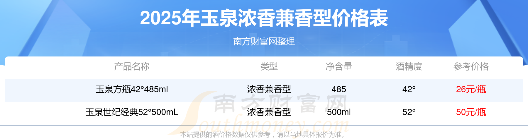 2025年玉泉濃香兼香型酒玉泉世紀(jì)經(jīng)典52°500mL、玉泉方瓶42°485ml等最新價(jià)格如下: